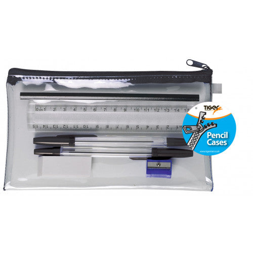 Clear (Exam style) 8 x 4inch/20 x 10cm pencil case with clear insert holding: 6in/15cm rule, HB Pencil, 2 black ball point pens, pencil sharpener and eraser.