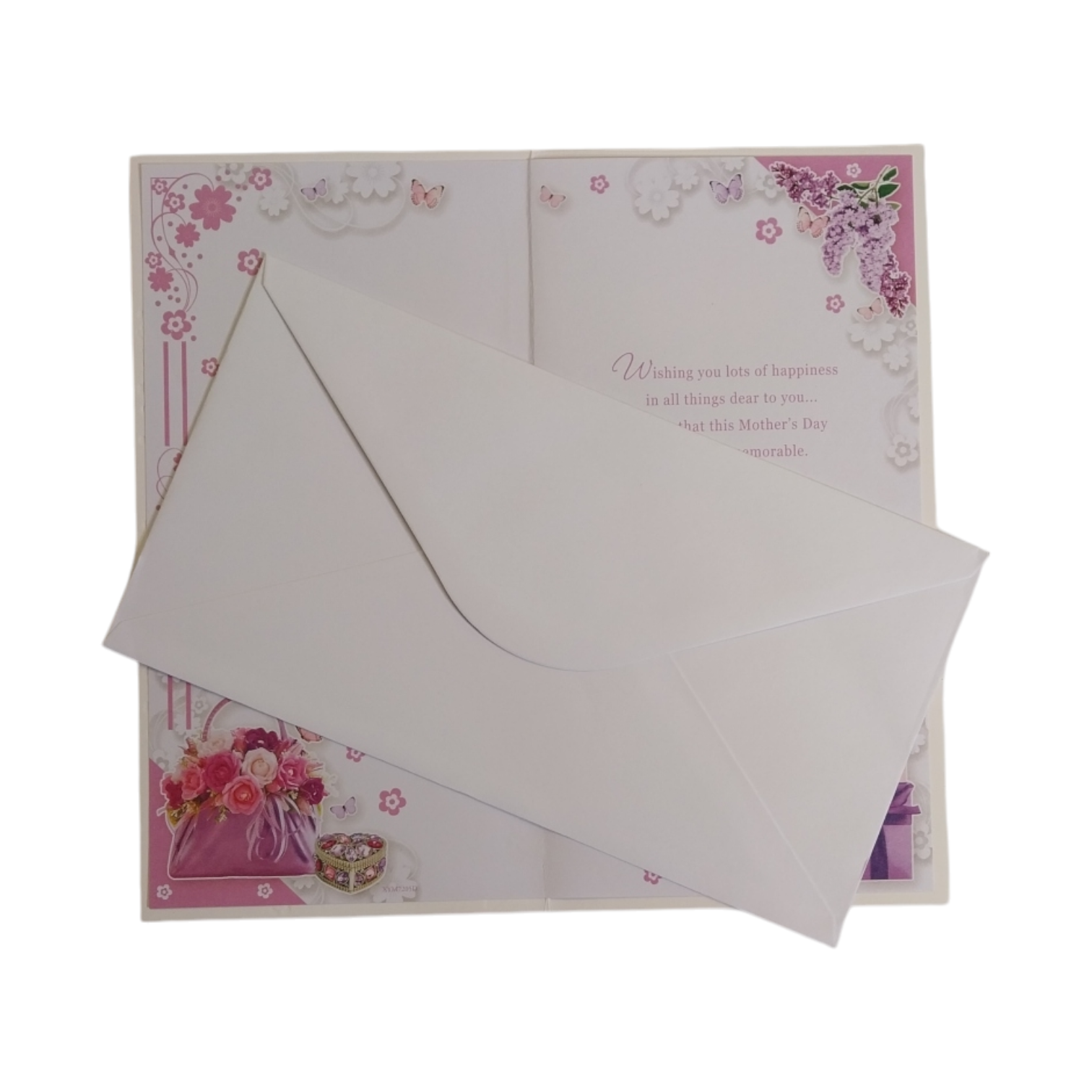 For Someone Special a beautiful Mother's day wish and let her know she means the world to you with this Mother's Day card from Xpress Yourself. A pretty card, suitable for sending a kind, heartfelt message on mother's day. Featuring a beautiful design of Purse and Gifts, with the heartfelt message with a floral border and embossed, gold foil details. The card comes with a coordinating envelope. Card size approx. : 27.5 x 18.5cm.