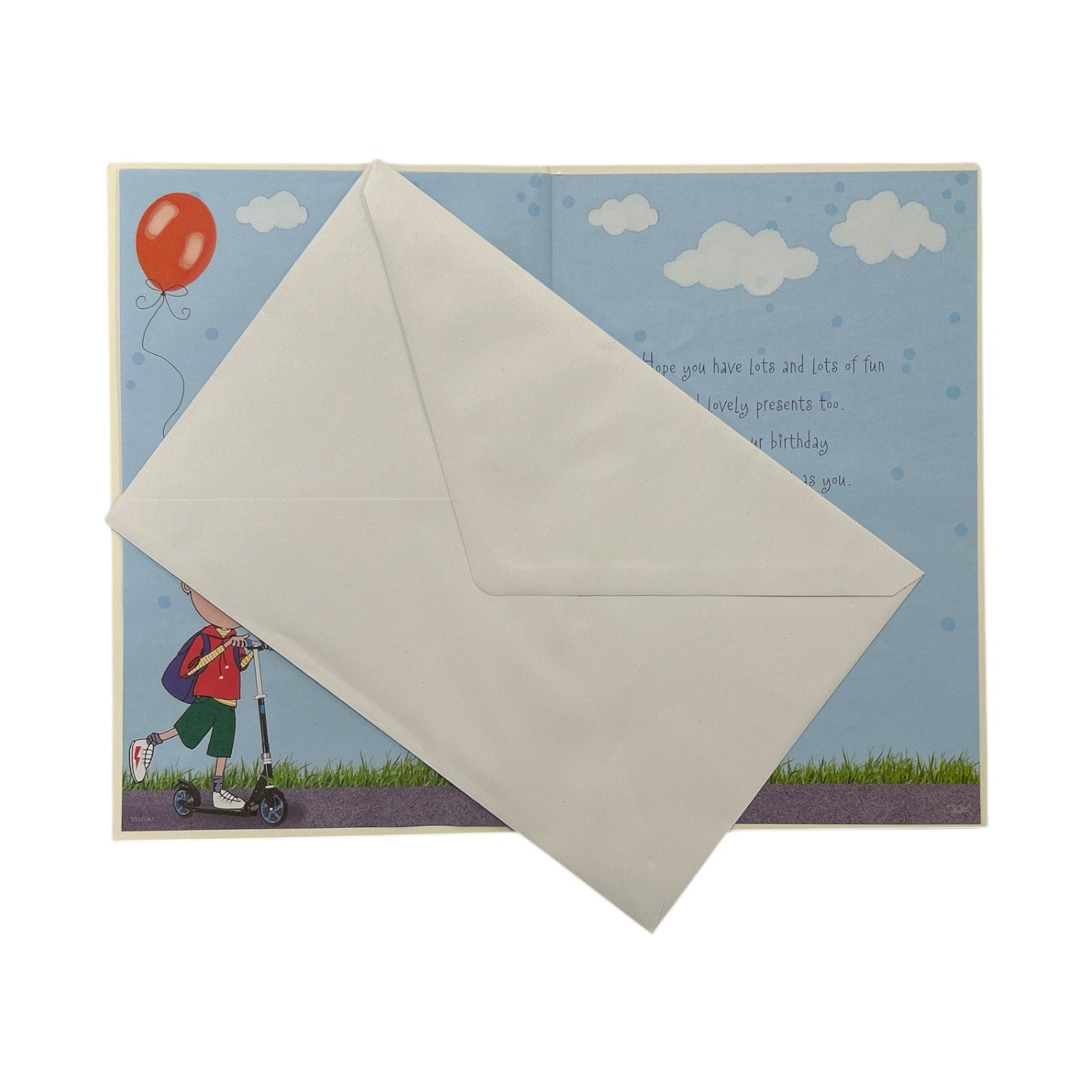 Celebrate a fun-filled 6th birthday with this playful and exciting birthday card! The card features a boy riding a scooter, accompanied by his trusty dog by his side. The background showcases a blue sky with fluffy clouds, glitter stars, and festive star foil balloons and orange balloons that add a cheerful touch to the scene. The text "Son You're 6 Today" and "Birthday" are in bright, multicolored lettering, creating a joyful and celebratory vibe. A special large, round badge with the words "6 Today" adds a fun and interactive element to the card. Inside, yo u'll find heartfelt birthday wishes, making this the perfect card to send your love and best wishes on his milestone day. The card comes with a coordinating envelope. Approximate size: 27.5 x 18.5.