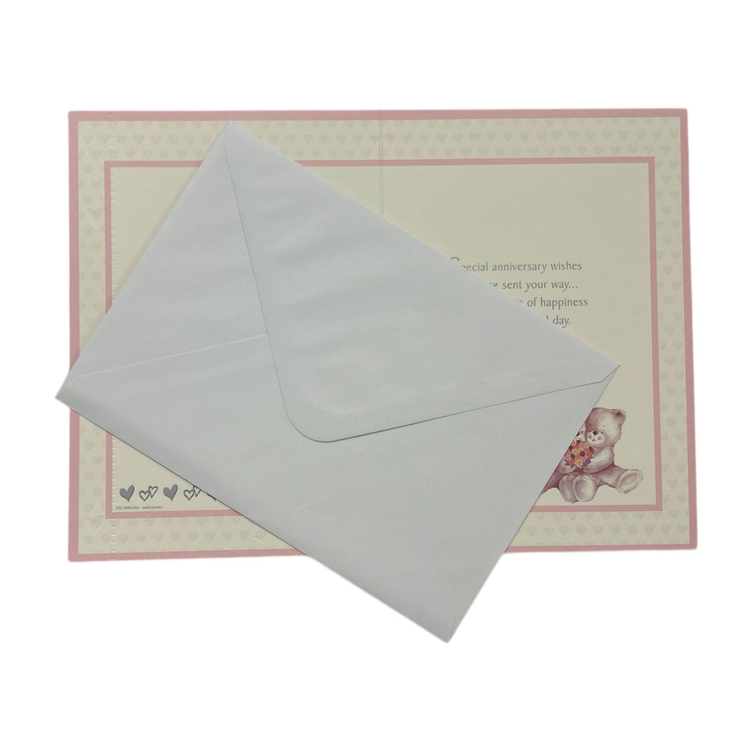 This charming anniversary card celebrates a Son & Daughter-in-Law's special day with warmth and affection. At its center, two adorable teddy bears embrace within a rich purple heart shape, symbolizing love and togetherness. The bears hold champagne flutes, adding a celebratory touch to the design. The heart is suspended from a delicate silver bow, elegantly adorned with small yellow flowers, enhancing its whimsical appeal. The background is a soft light beige, gently decorated with scattered small hearts for a romantic and heartfelt feel. Along the vertical edges, a decorative border featuring small flowers and hearts in shades of purple and beige adds a refined finishing touch. Inside, thoughtful anniversary wishes complete this beautifully designed card, making it a perfect keepsake for the happy couple. The card comes with a coordinating envelope. Card size: Approx. 19.5 x 14 cm.