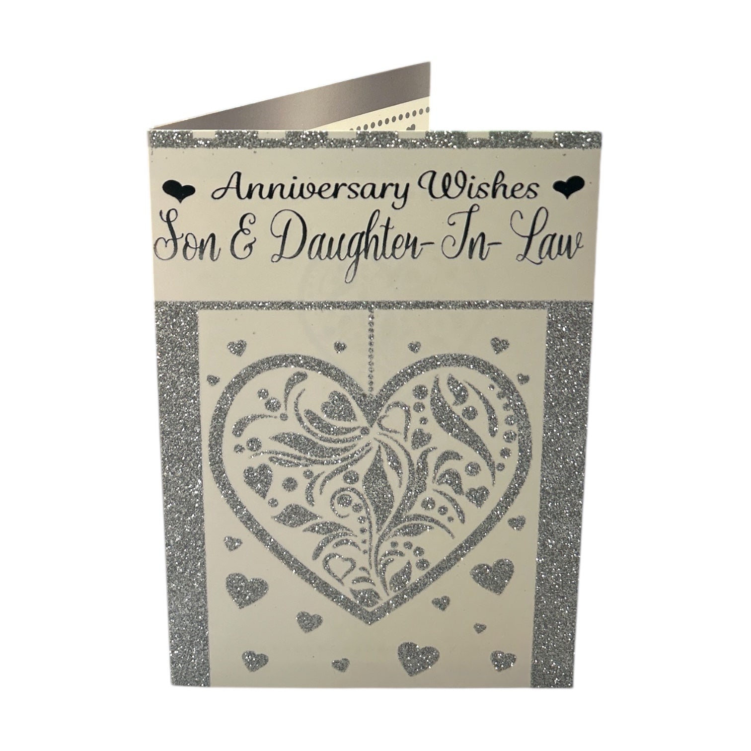 This is a Son & Daughter-In-Law Anniversary Greeting Card, designed to celebrate their special day with elegance and love. A soft cream background with a luxurious silver glitter finish at the bottom. Small scattered hearts and glitter accents enhance the romantic feel. It comes complete with a coordinating envelope. Card size: Approx. 19.5 x 14 cm.