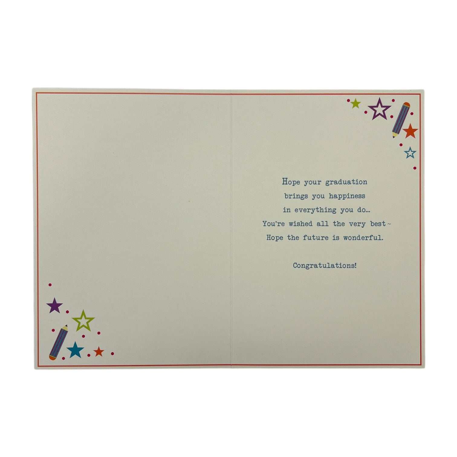 This is a congratulatory graduation card with a celebratory design. Surrounding the text are decorative elements, including gold and multicolored stars, as well as small illustrated pencils. The card has a festive and cheerful appearance, making it perfect for celebrating a graduate's achievement. The elegant design is enhanced with embossed details foil accents. Complete with a coordinating envelope. Card size: Approx. 19.5 x 14 cm.