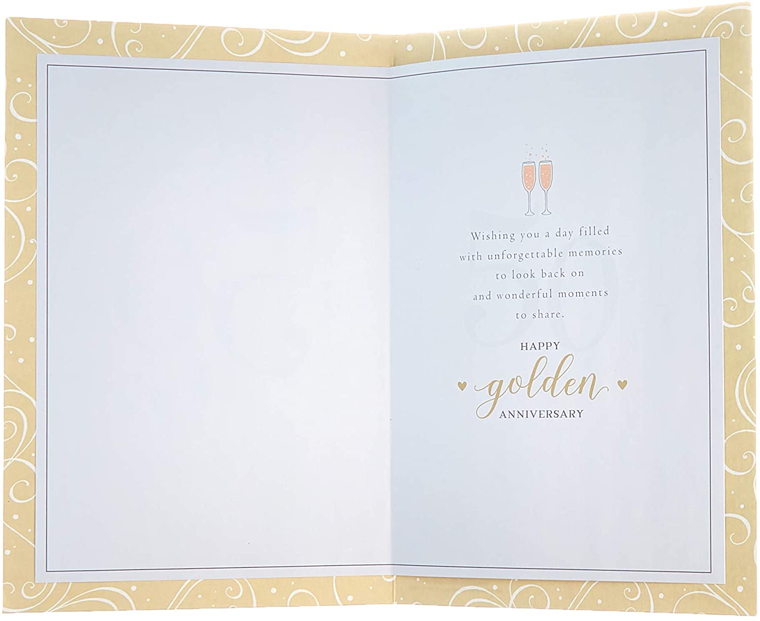 This fun, contemporary golden wedding anniversary card is the perfect way to say congratulations to a special couple celebrating 50 happy years together. Editorial inside reads: Wishing you a day filled with unforgettable memories to look back on and wonderful moments to share. Happy Golden Anniversary. Envelope included. 50th Wedding Anniversary Card. Size: 229 x 149mm.