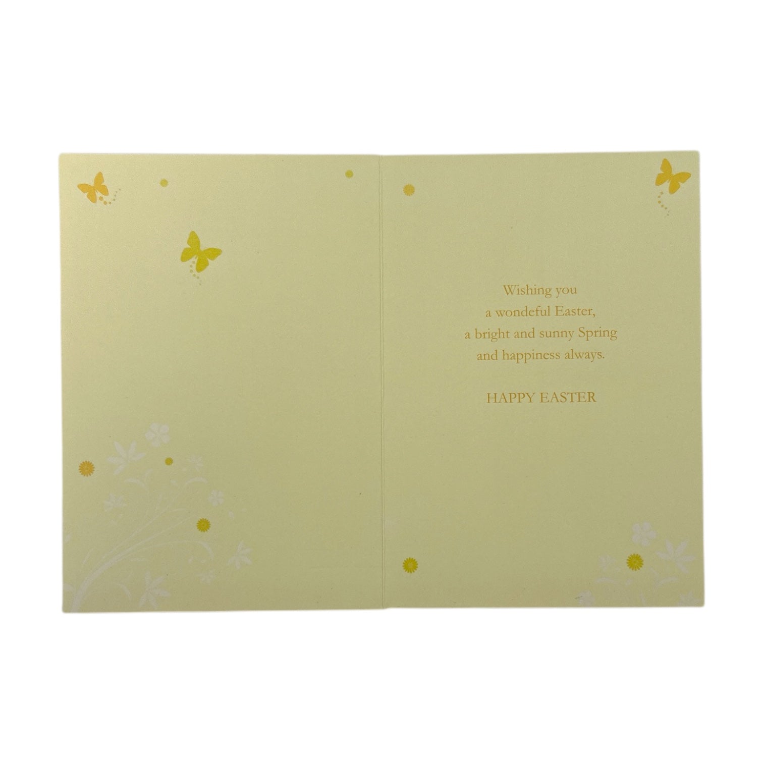 Send warm Easter wishes to a special friend with this beautifully designed Easter card. Featuring a charming illustration of bright spring daffodils and delicate butterflies, this card perfectly captures the beauty and joy of the season. Elegant embossed details and shimmering foil accents add a touch of sophistication, making it a keepsake to treasure. The front message reads, "For a Special Friend at Easter," expressing heartfelt appreciation and seasonal cheer. Complete with a coordinating envelope, this card is a wonderful way to share love, friendship, and Easter blessings. Card size: Approx. 19.5 x 14 cm.