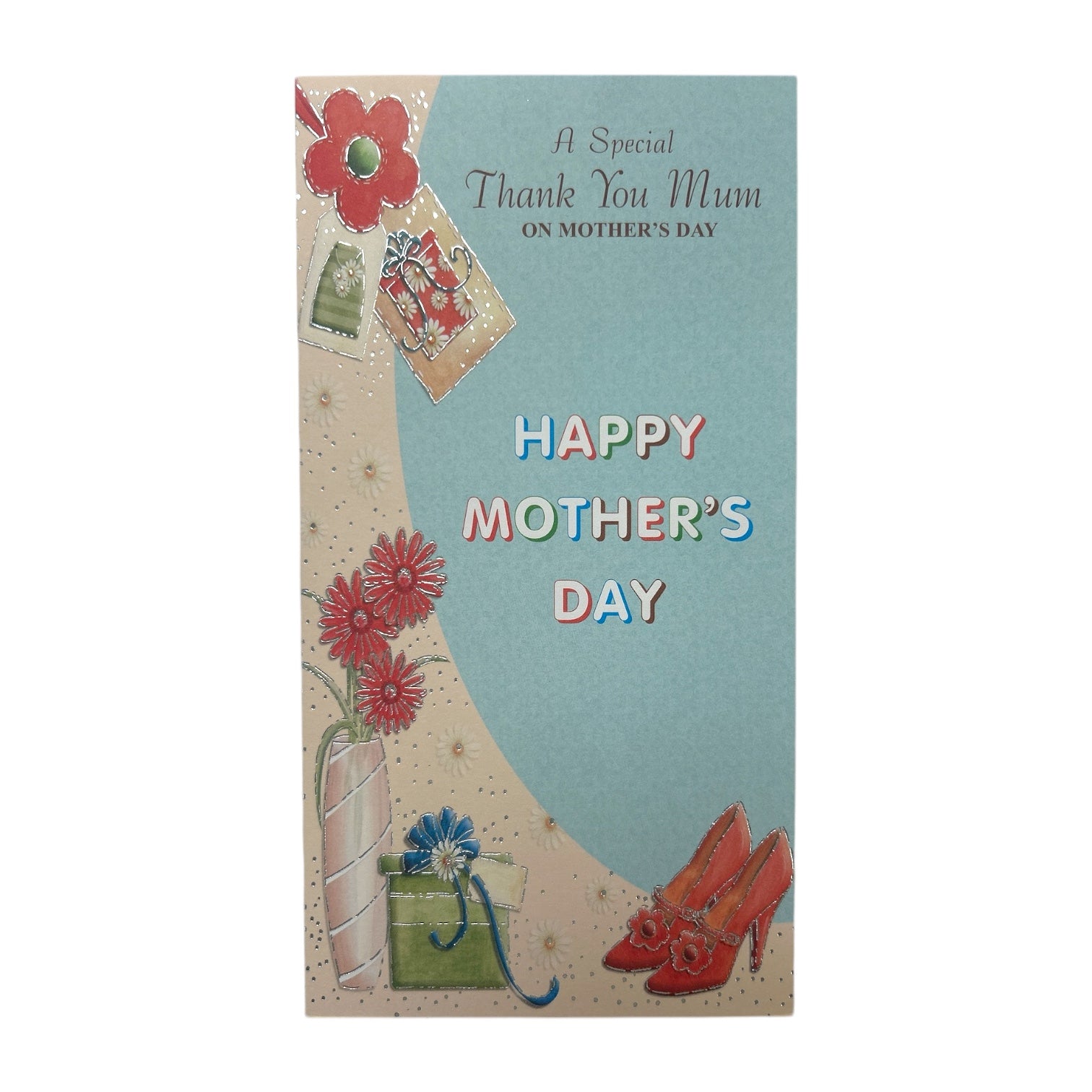 This vintage-style Mother's Day card features a light teal background adorned with decorative flowers, elegant gift boxes, and stylish high-heeled shoes, creating a charming and nostalgic design. The words "HAPPY MOTHER'S DAY" are displayed in a stylized, eye-catching font, serving as the central message. Above it, the text "A Special Thank You On Mother's Day" adds a personal and heartfelt touch. Measuring approximately 23cm x 12cm, this beautifully designed card is a perfect way to express love and appreciation on Mother's Day.