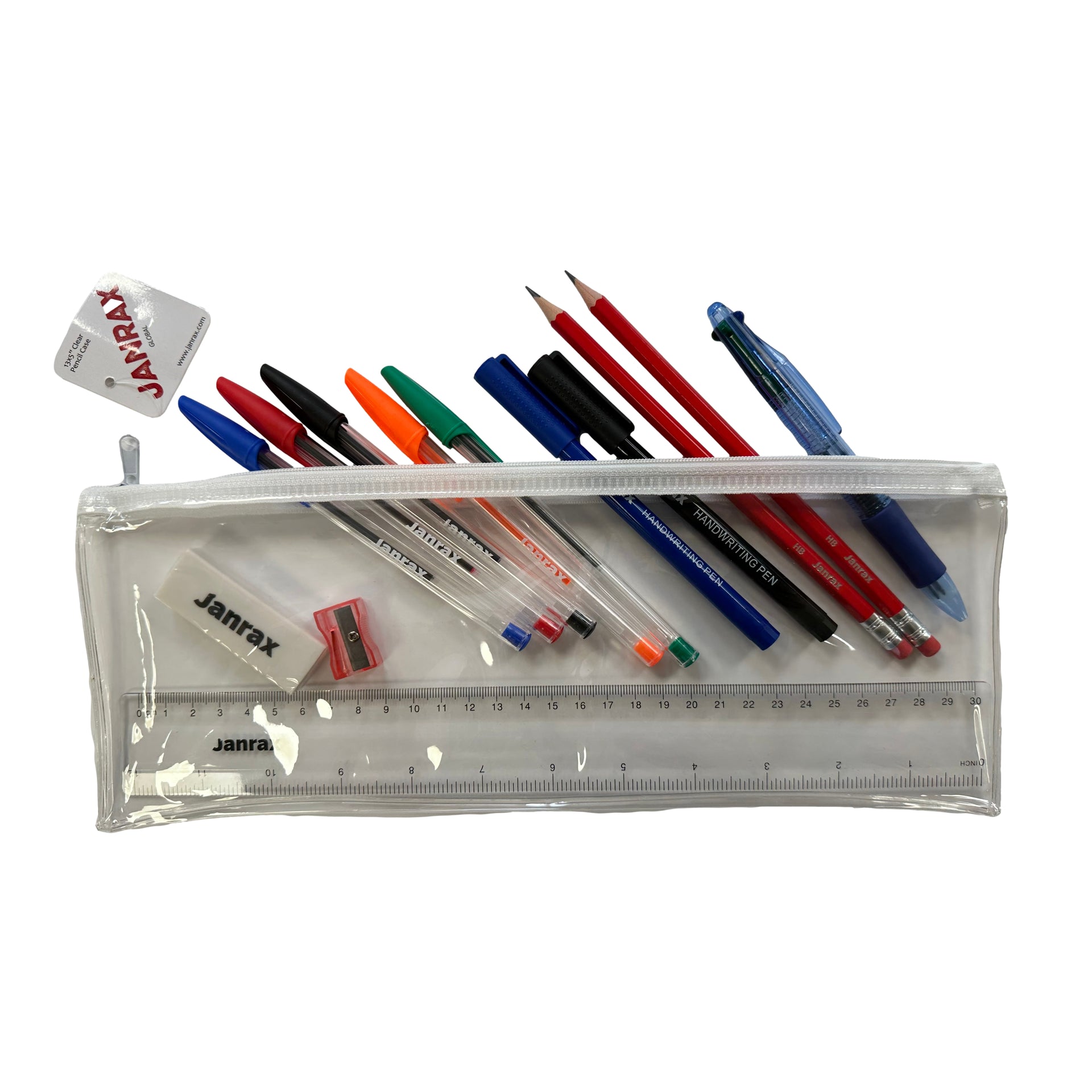 The Filled White Zip Clear Exam Pencil Case is a well-organised and durable study companion that comes filled with essential stationery products. It includes 2 HB pencils, 4 in 1 colour pen, 5 assorted ballpoint pens, 1 blue ink handwriting pen, 1 black ink handwriting pen, a 15cm ruler, a quality PVC eraser and a pencil sharpener. The transparent design allows you to easily see and access the stationery. Whether you are a student gearing up for exams or a professional seeking efficiency, this pencil case is your go-to solution. Stay organised and efficient with this pencil case set.