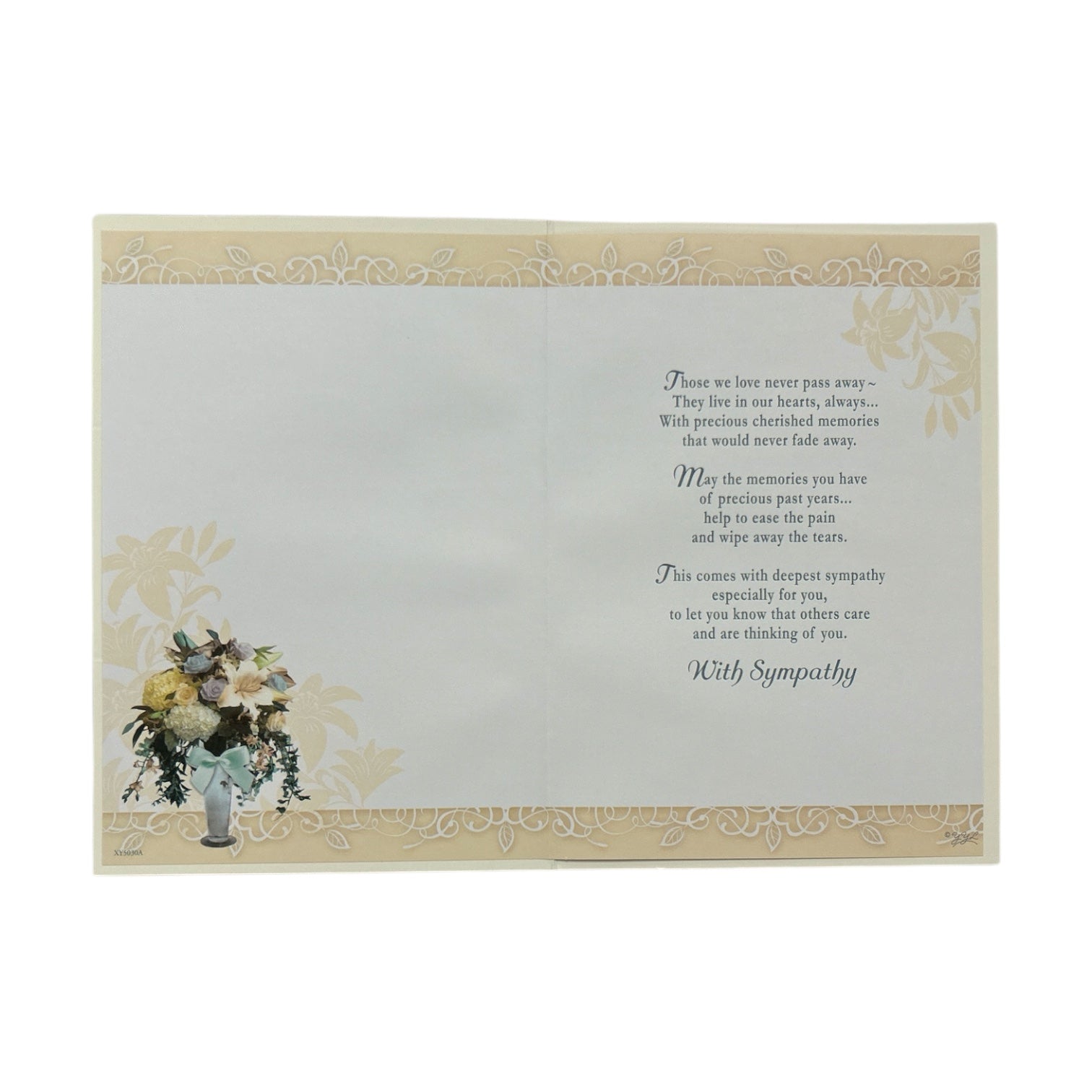 This elegant sympathy card conveys heartfelt condolences for the loss of a husband with a beautiful floral arrangement in a vase. The varied flowers, including roses and lilies, symbolize love, remembrance, and peace. The light beige or cream background creates a soft and comforting tone. The heading "With Sympathy" is prominently displayed, followed by "On the Loss of Your Husband" in a refined and respectful font. A heartfelt message of condolence is included below, offering comfort and support during this difficult time. The card’s traditional yet elegant design reflects warmth, care, and sincerity. The card comes with a coordinating envelope. Approx Size: 190 x 140mm.