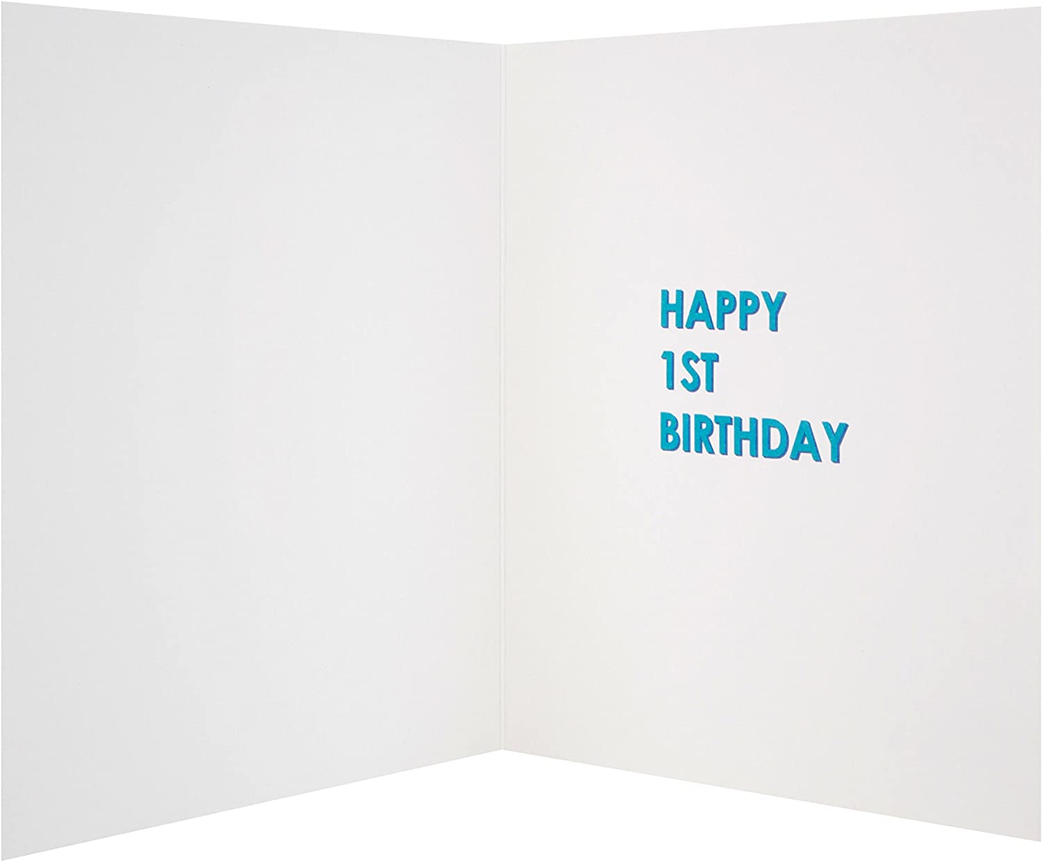Boy 1st Birthday Greeting Card. Message inside card reads: 'Happy 1st Birthday'. Finish: Foil. Envelope: White. Size: 185 x 165mm.