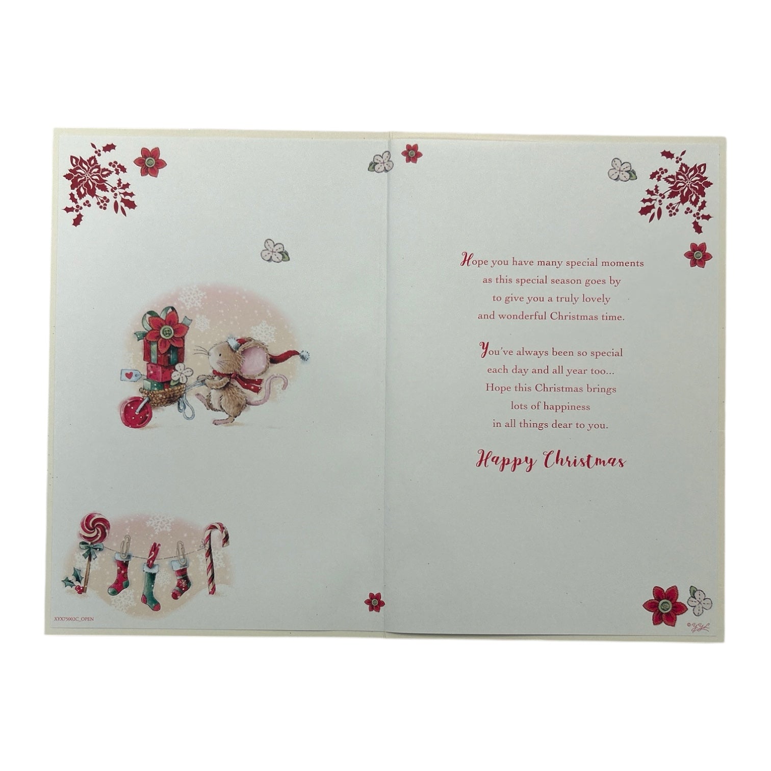 Send warm holiday wishes to a cherished daughter-in-law with this delightful Christmas card. Featuring a charming illustration of a mouse pulling a festive cart brimming with presents, the scene is accented with snowflakes, holly, stylized flowers, and a garland of stockings, candy canes, and lollipops. The message, “To a dear Daughter-in-law, With Special Thoughts at Christmas,” is elegantly displayed, adding a heartfelt touch. This cheerful design conveys joy, warmth, and festive sentiment. Approx. size 225 x 155mm, supplied with a coordinating envelope.