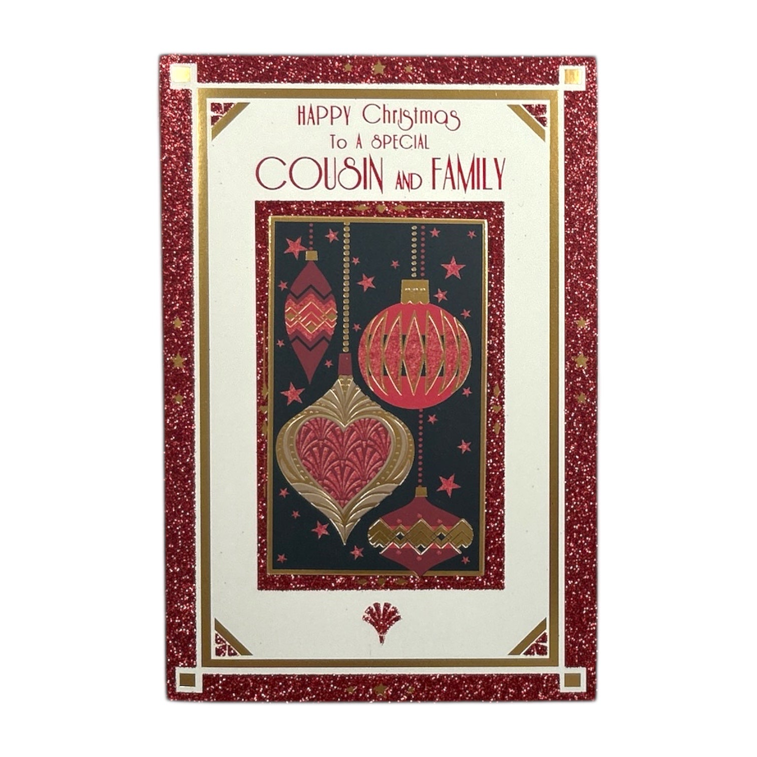This elegant Christmas card is a festive tribute to a special cousin and their family. Featuring five beautifully detailed ornaments in red and gold tones, the design evokes warmth and tradition. Each ornament—ranging from hearts to baubles—is suspended against a rich, star-speckled background, adding depth and seasonal charm. The glittered red border and gold accents enhance the card’s luxurious feel, while ornate corner flourishes complete the sophisticated look. The greeting “Happy Christmas” is prominently displayed in graceful lettering, making it perfect for heartfelt holiday wishes. Ideal for catalog presentation or personal gifting, this card blends classic motifs with refined craftsmanship. A standout choice for those who appreciate festive elegance. Approximate size: 225 x 155 mm.
