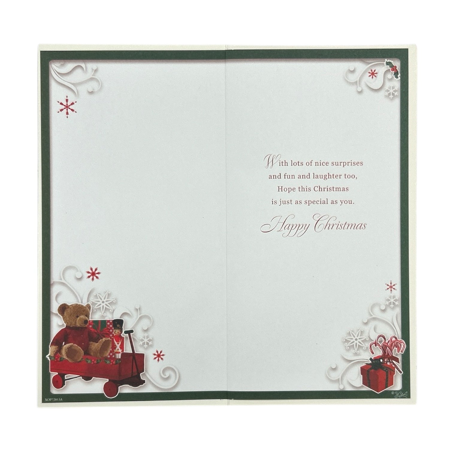 Send warm holiday wishes to your cousin with this charming Christmas card full of festive delight. Featuring a cozy winter scene with a teddy bear nestled in a red wagon, surrounded by wrapped presents, candy canes, and a classic nutcracker, it captures the joyful spirit of the season. Ornate snowflakes and elegant white patterns add a touch of magic to the background, making the card feel both playful and heartfelt. The cheerful message inside celebrates the treats, surprises, and love that make Christmas so special. Designed to bring a smile and a sense of togetherness, this card is perfect for sharing affection and holiday cheer. It’s a sweet and thoughtful way to show your cousin they’re truly loved this festive season.