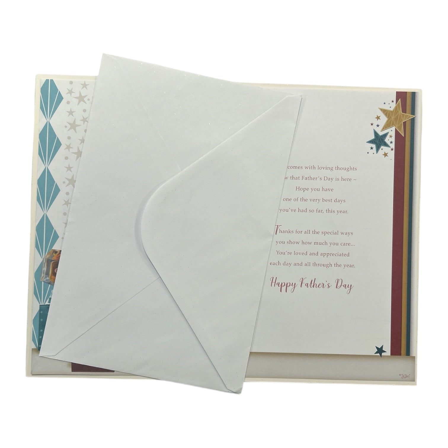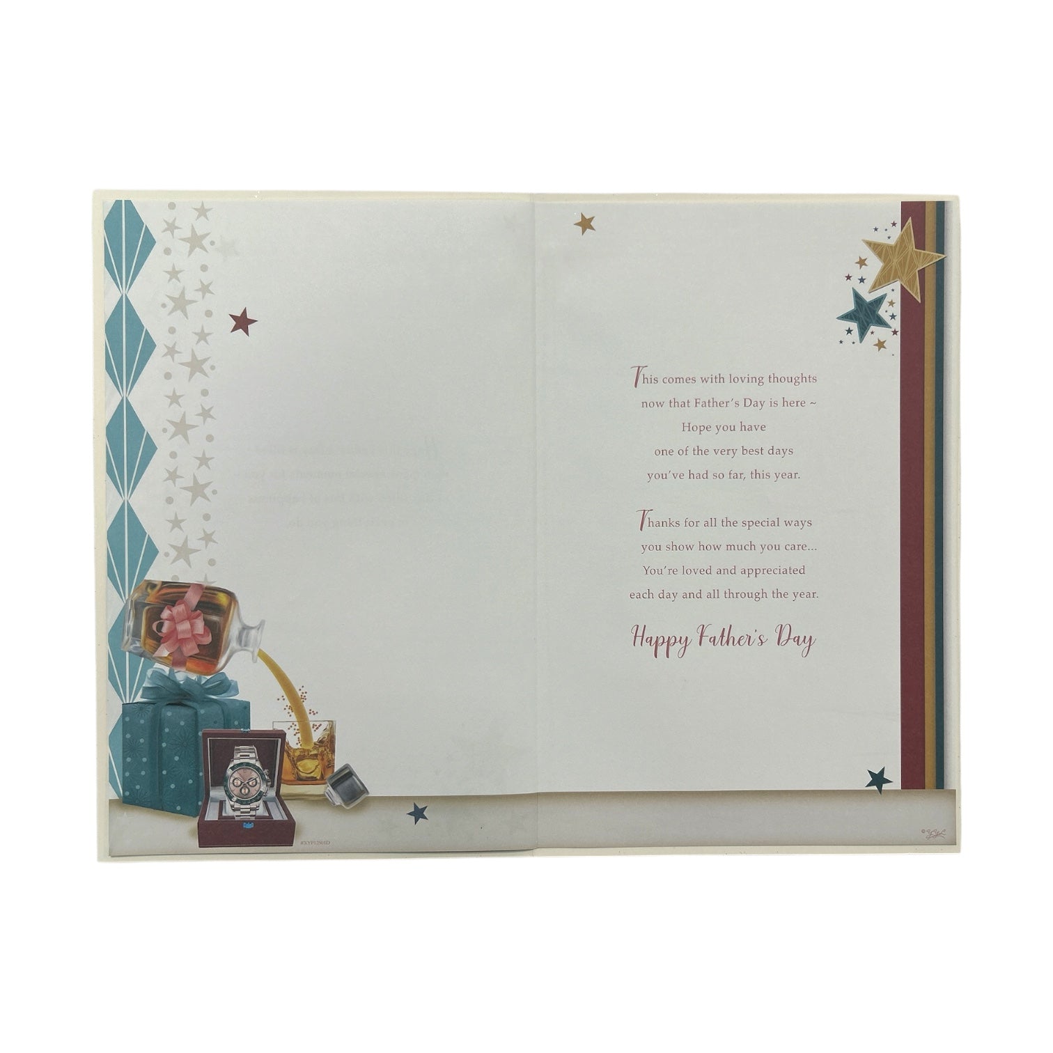 This Father’s Day, show your dad just how much he means to you with this elegant and heartfelt card. showcases a beautiful arrangement of a gift box, a stylish watch gift, and a wine bottle with a glass, all surrounded by sparkling stars. The design is enriched with foil details and embossed elements, adding texture and a luxurious touch. Glitter-finished accents bring extra shine and charm to the card. making the card truly special. Inside, you’ll find sentimental wishes that express your deep love and appreciation for the wonderful dad he is. The card comes with a coordinating envelope. Card size: approximately 27 x 18 cm.
