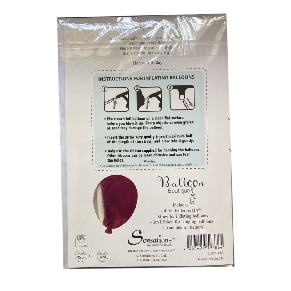 The card is designed by Balloon Boutique, known for their contemporary and high-quality balloon products, ensuring both style and durability. The card comes with four XOXO foil balloons, adding a playful and celebratory touch to the birthday greetings. These balloons are likely shaped like the letters "X" and "O," symbolizing hugs and kisses, and are made of shiny foil material. A straw is provided for inflating the balloons, ensuring easy setup. Additionally, a 2-meter ribbon is included for hanging the balloons, allowing for versatile display options to create a festive atmosphere. The card measures 230x150mm. It is specified that the balloons are for air fill only, indicating that they cannot be filled with helium. Upon opening the card, the recipient will find a heartfelt birthday message expressing love and warm wishes for their special day. The message may be accompanied by decorative elements or illustrations that enhance the overall aesthetic appeal.