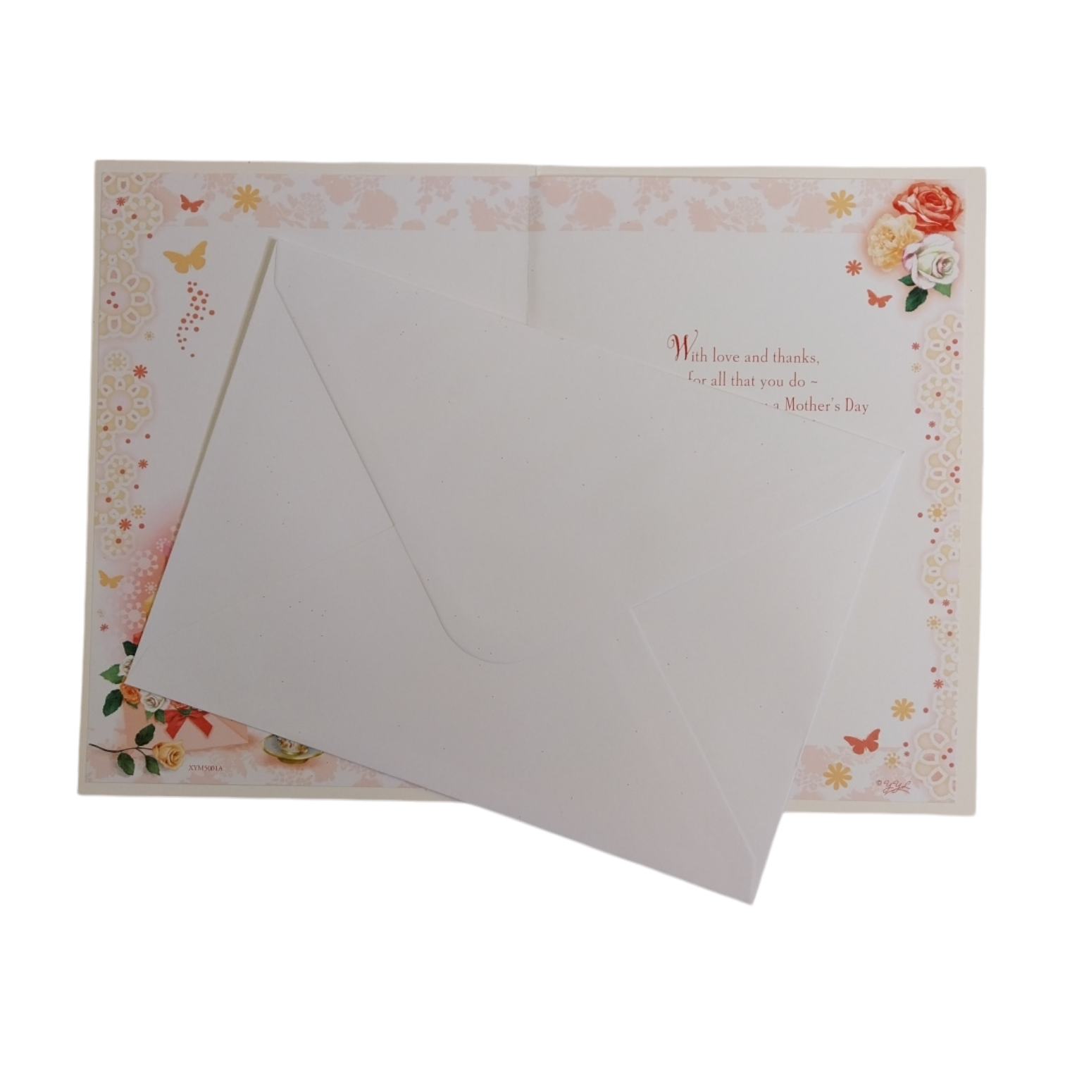 Send your Godmother a beautiful Mother's day wish and let her know she means the world to you with this Mother's Day card from Xpress Yourself. A pretty card, suitable for sending a kind, heartfelt message to your lovely Godmother on mother's day. Featuring a beautiful design of attractive gift boxes and a cup and saucer, with the heartfelt message with embossed, gold foil and glitter details. The card comes with a coordinating envelope. Card size approx. : 190 x 130mm.