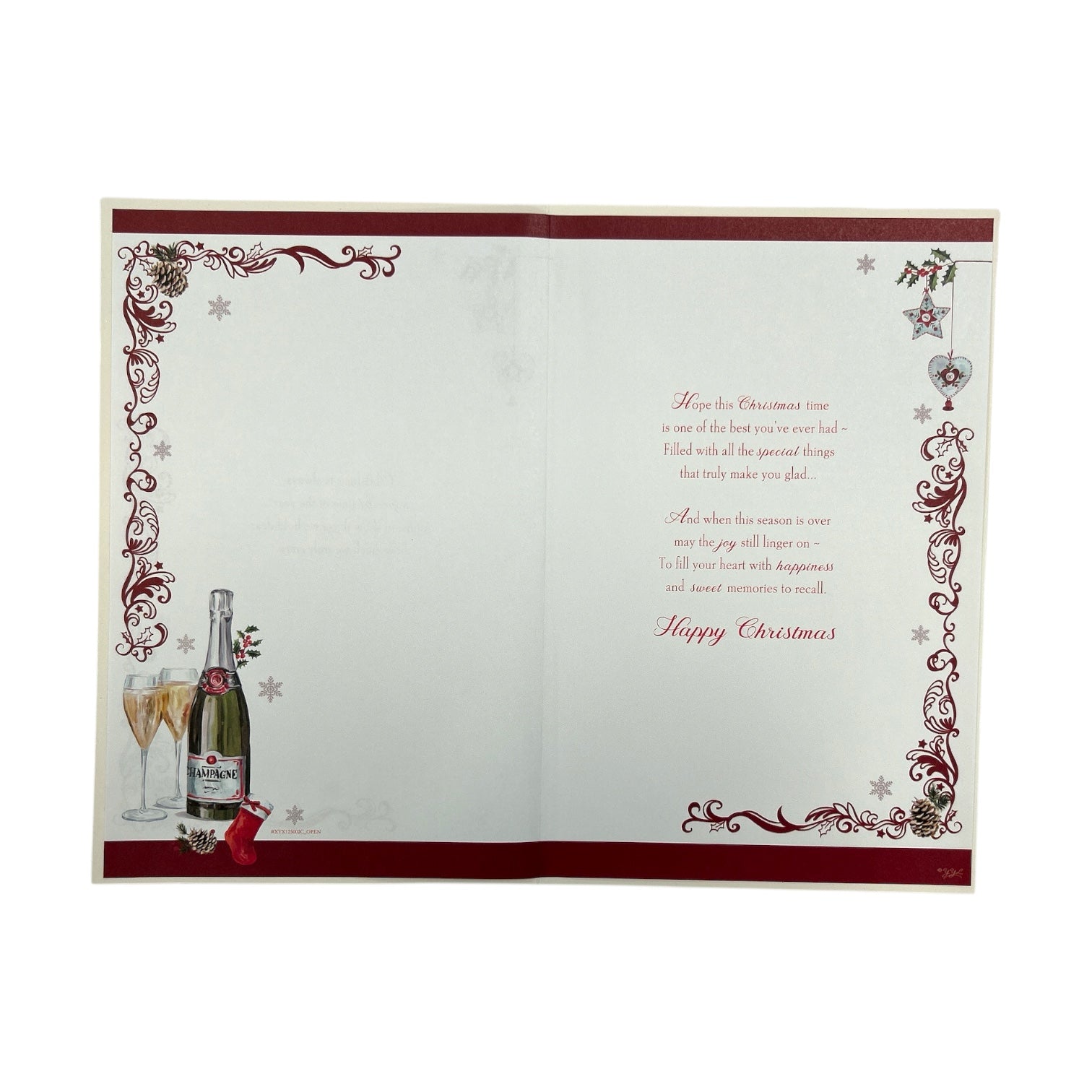 This elegant and festive Christmas card (size approx. 275 x 175 mm) is perfect for celebrating the season with your beloved parents. The beautifully detailed illustration features a sparkling bottle of festive fizz, two champagne flutes, a tray of luxurious chocolates, and a bowl of Christmas treats, all set against a cozy and decorative backdrop with golden accents. Surrounded by holly, stars, and festive ornaments, the card captures the warmth, joy, and indulgence of a holiday celebration. A heartfelt way to show Mum and Dad how much they’re loved at Christmastime.