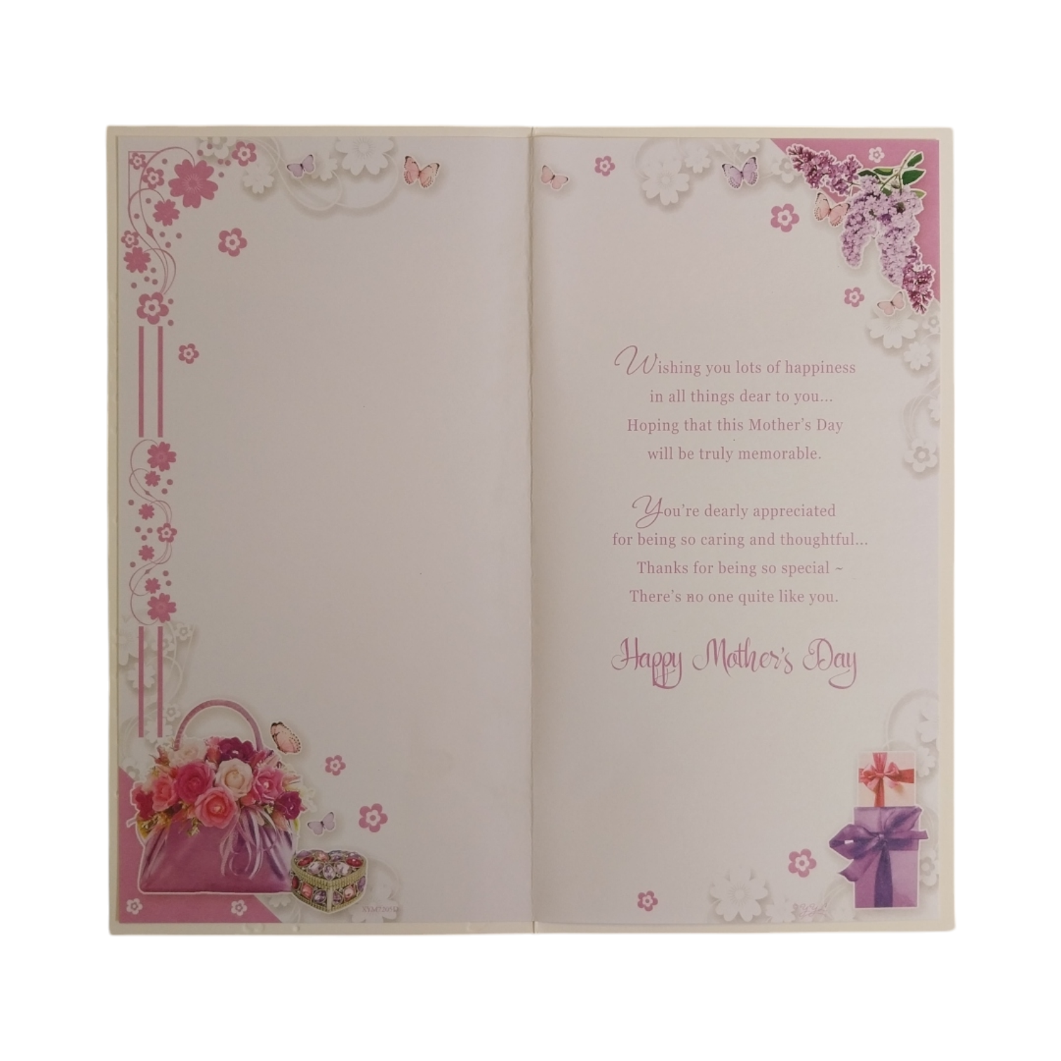 Send your Nanna a beautiful Mother's day wish and let her know she means the world to you with this Mother's Day card from Xpress Yourself. A pretty card, suitable for sending a kind, heartfelt message to your lovely Nanna on mother's day. Featuring a beautiful design of attractive Purse and Gifts, with the heartfelt message with a floral border and embossed, gold foil details. The card comes with a coordinating envelope. Card size approx. : 27.5 x 18.5cm.