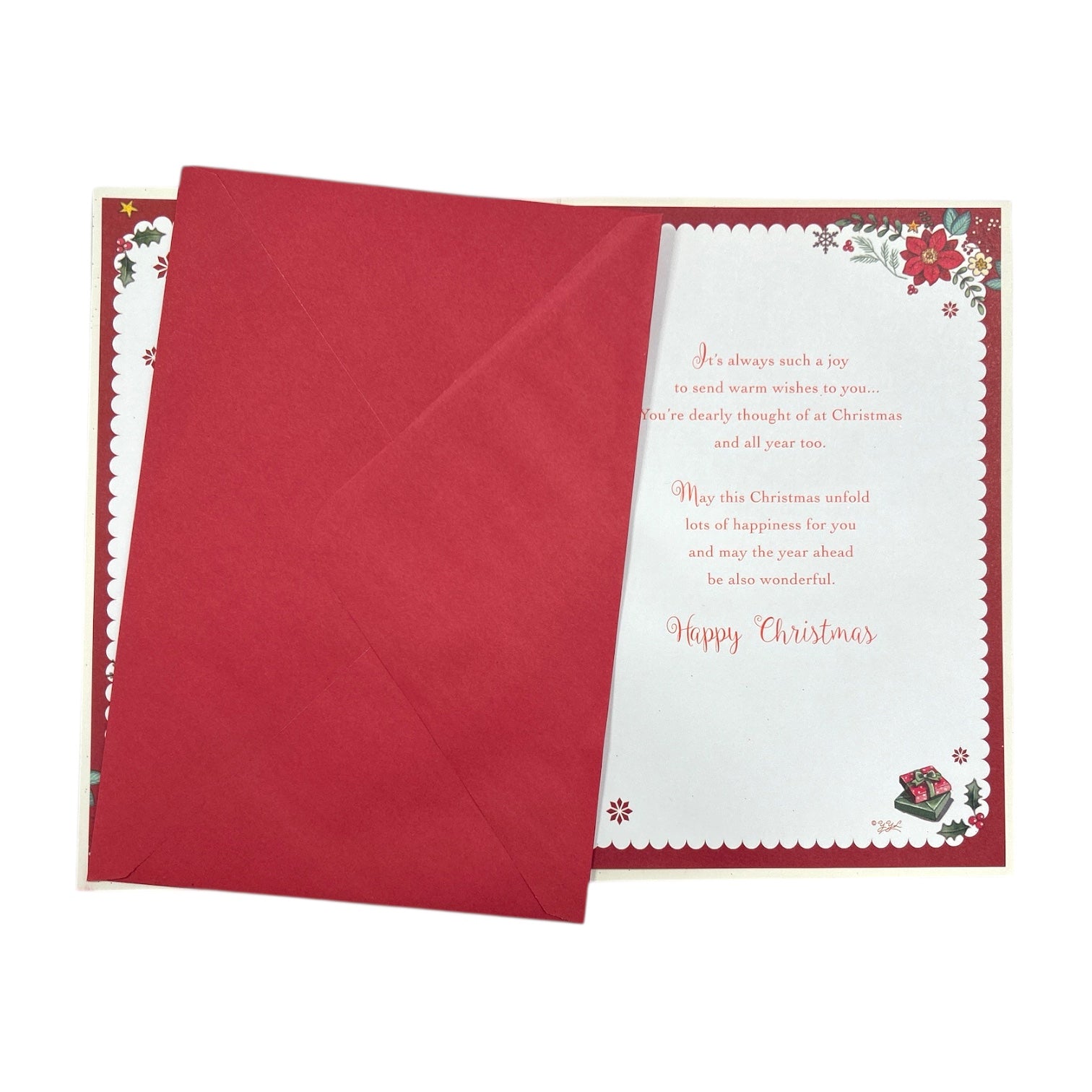 This adorable Christmas card is a joyful way to celebrate a special Nannie during the festive season. At the heart of the design is a cheerful teddy bear dressed in a glittery red Santa outfit, holding a tray of holiday treats with warmth and charm. Surrounding the bear are beautifully illustrated Christmas elements including wrapped gifts, holly sprigs, crackers, stars, and vibrant poinsettias, all enhanced with sparkling glitter and rich festive colors. The red glitter border and gold accents add a luxurious touch, making the card both playful and elegant. The message “Have the Loveliest Christmas” is lovingly scripted to convey heartfelt wishes. Perfect for gifting or catalog presentation, this card blends whimsical delight with seasonal sophistication. A standout choice for expressing love and appreciation to a cherished Nannie. Approximate size: 225 x 155 mm.