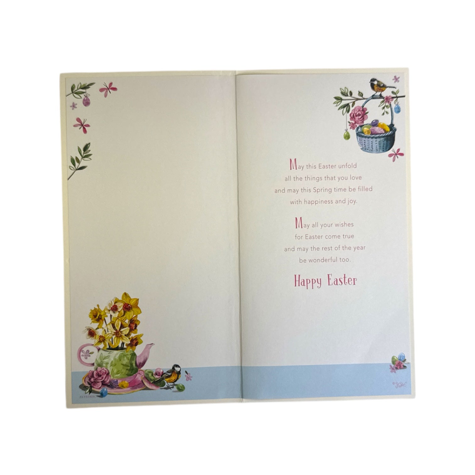 Wish a friend or family member a happy Easter with a sweet Easter card that's sure to brighten their day. Cover Featuring chick on tree, hanging bucket of easter eggs, with easter eggs decorated in vibrant patterns, spring green leaves add a whimsical touch to the festive design, with the words "To All The Family Happy Easter" on the front and easter wishes message inside. The card comes with a coordinating envelope. Card size approx. : 23 x 12cm.