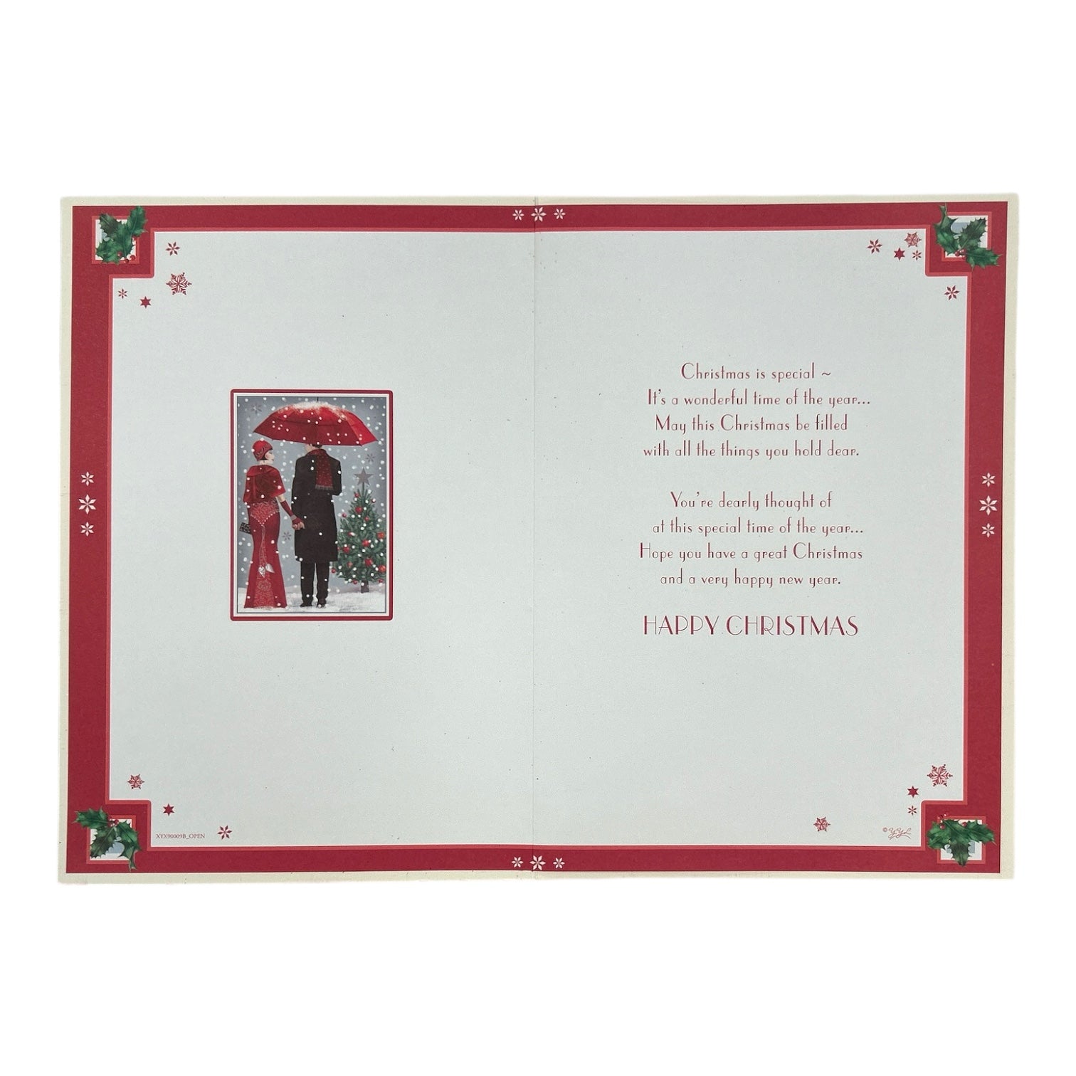This Christmas card for "Both of You" features a romantic winter scene of a couple walking together under a red umbrella, dressed in elegant 1920s-style attire. Set against a softly falling snow backdrop with a beautifully decorated Christmas tree, the design is accented with glitter and foil for a festive touch. The refined red, black, and white color scheme evokes a sense of quiet celebration and timeless charm, making it a perfect way to send warm and heartfelt wishes to a special couple this holiday season.