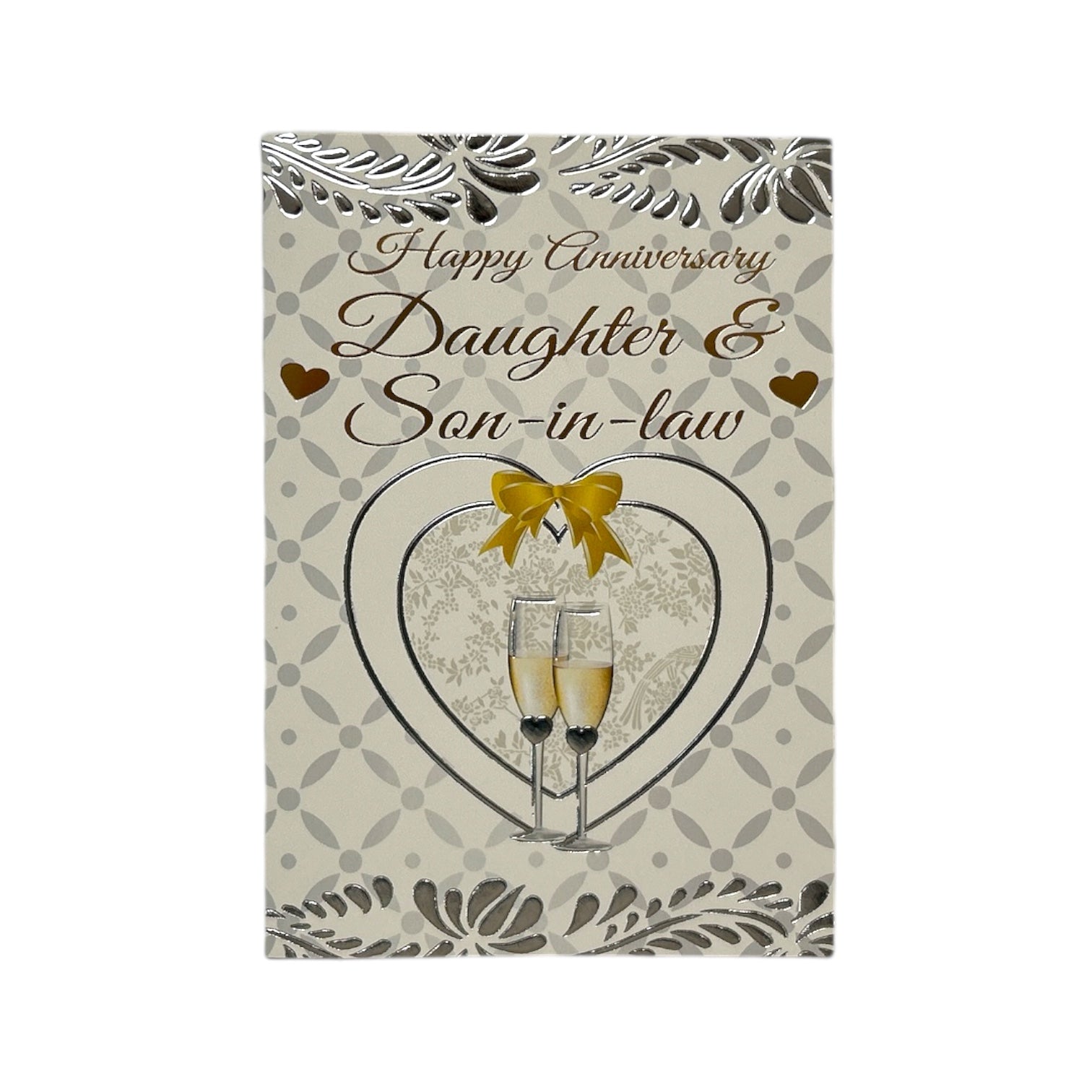 This elegant Daughter & Son-in-Law Anniversary Card features a light beige base with a beautifully designed heart-shaped frame at the center. Within the frame, two champagne flutes are delicately illustrated, as if toasting in celebration. The background showcases a subtle embossed pattern, adding texture and sophistication. Silver and gold detailing enhance the design, while a golden ribbon provides a graceful contrast. The muted pastel tones create a soft, romantic ambiance. The heartfelt message, "Happy Anniversary Daughter & Son-in-Law," is prominently displayed, making this card a perfect way to convey warm wishes on their special day. Inside, thoughtful anniversary wishes complete the sentiment. The card comes with a coordinating envelope. Card size: Approx. 19.5 x 14 cm.