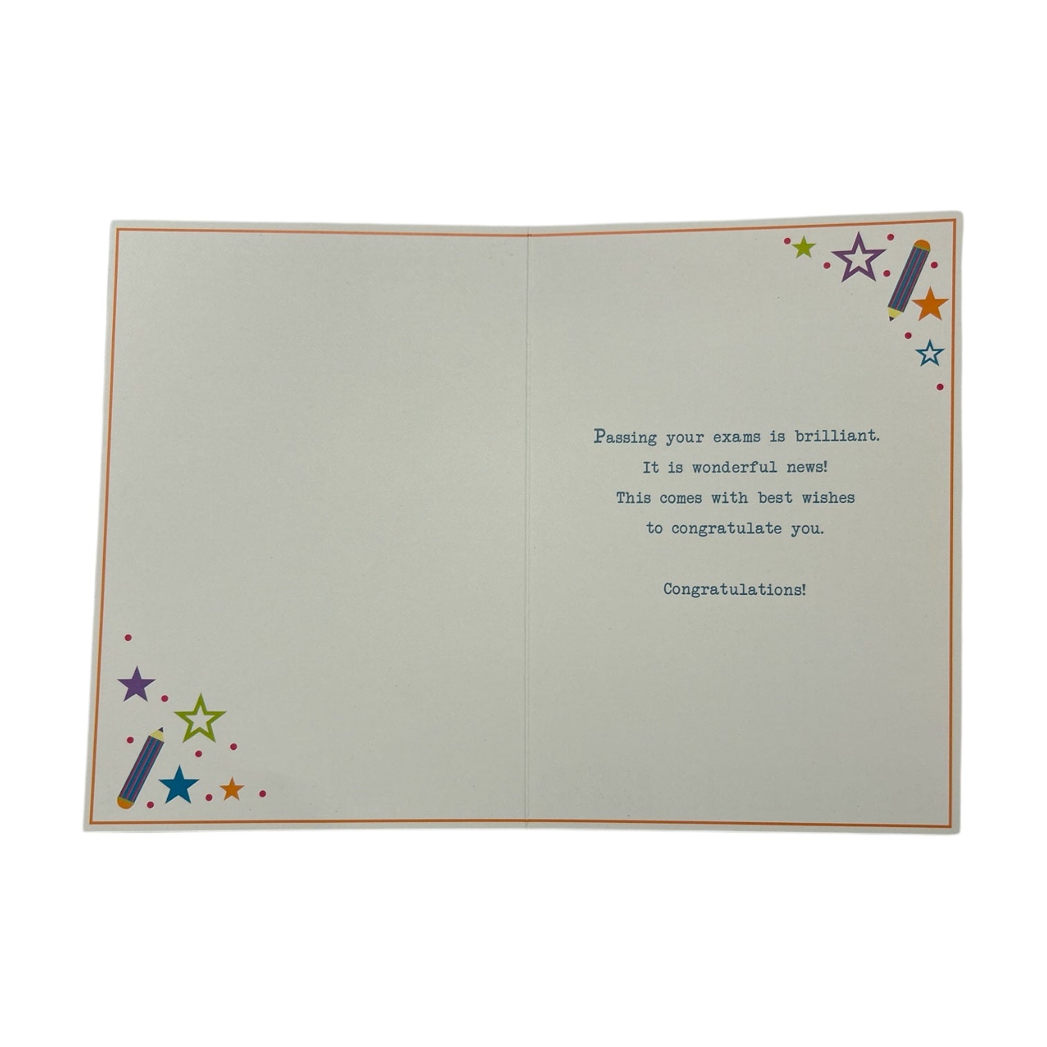 This is a congratulatory card with a celebratory design. Surrounding the text are decorative elements, including gold and multicolored stars, as well as small illustrated pencils. The card has a festive and cheerful appearance, making it perfect for celebrating an achievement. The elegant design is enhanced with embossed details foil accents. Complete with a coordinating envelope. Card size: Approx. 19.5 x 14 cm.