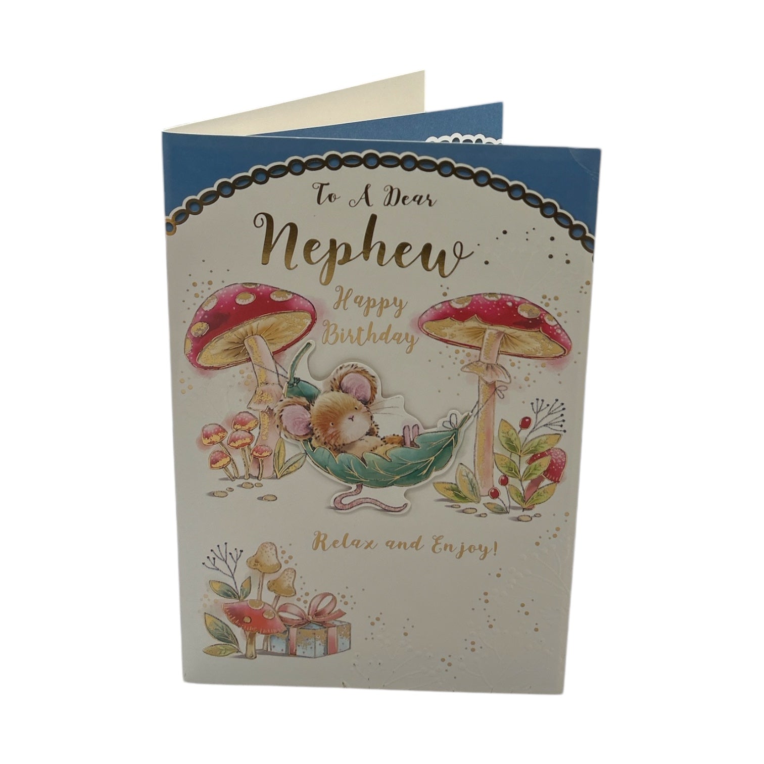 Celebrate your Nephew’s special day with this adorable and fun Birthday Card. The front features a charming design of a mouse relaxing and enjoying a swing made from a mushroom, creating a playful and whimsical atmosphere. The card is beautifully enhanced with foil details and embossed elements, adding depth and a touch of elegance. Inside, you’ll find warm Birthday Wishes to express your love and excitement for his big day. This card is the perfect way to make your nephew’s birthday even more memorable. The card comes with a coordinating envelope. Card Size: Approx. 19.5 x 14 cm.