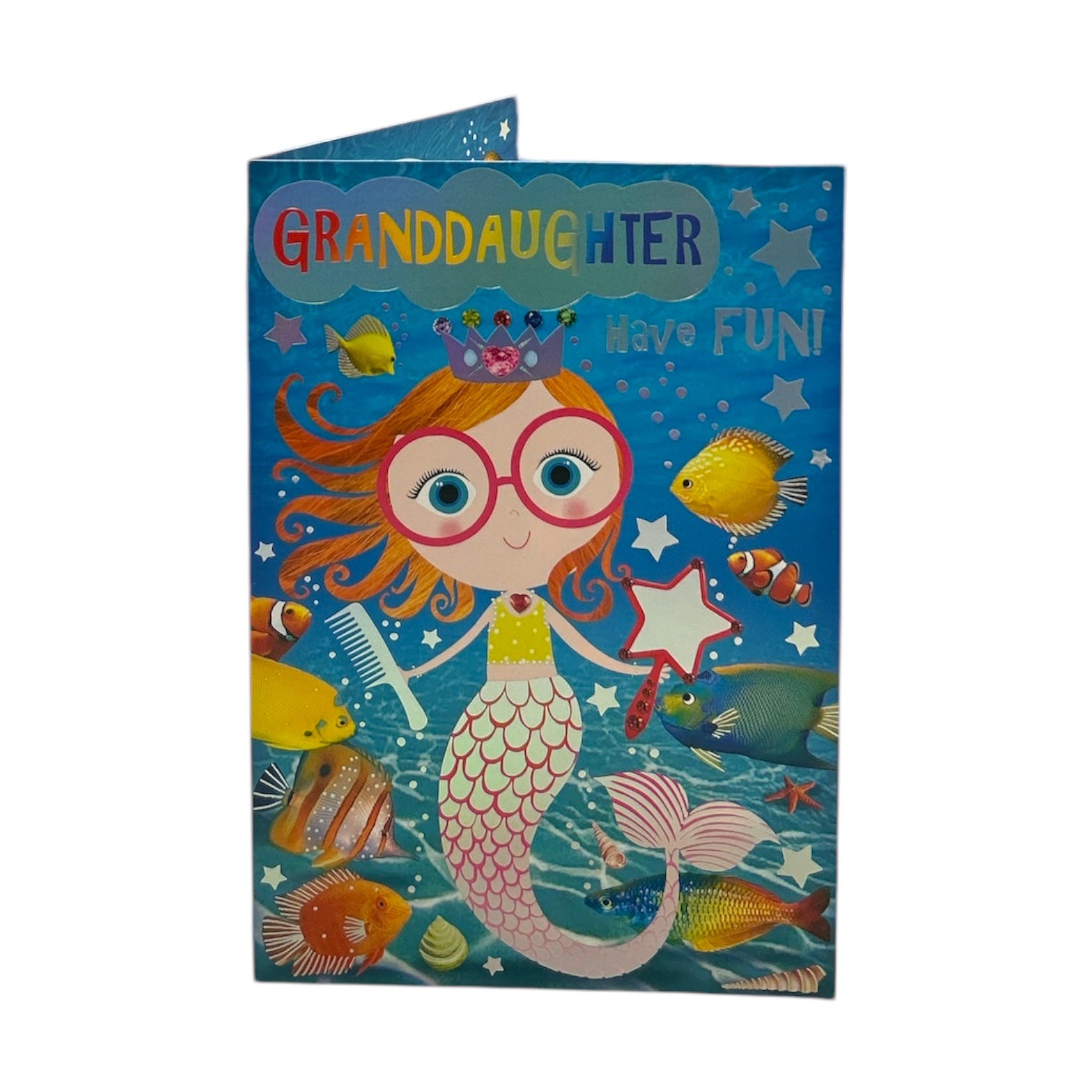 Celebrate your granddaughter’s special day with this enchanting mermaid-themed birthday card. The front features a beautiful mermaid princess inside a fish aquarium, surrounded by vibrant, multi-colored fish, bringing the magic of the sea to life. At the top, the words "Granddaughter Have FUN" are displayed in a colorful, slightly embossed font, adding an extra touch of joy and excitement to her birthday. Inside, the card continues with lovely birthday wishes, making it the perfect way to wish her a wonderful day. The card comes with a coordinating envelope. Card size approx. : 19 x 13cm.