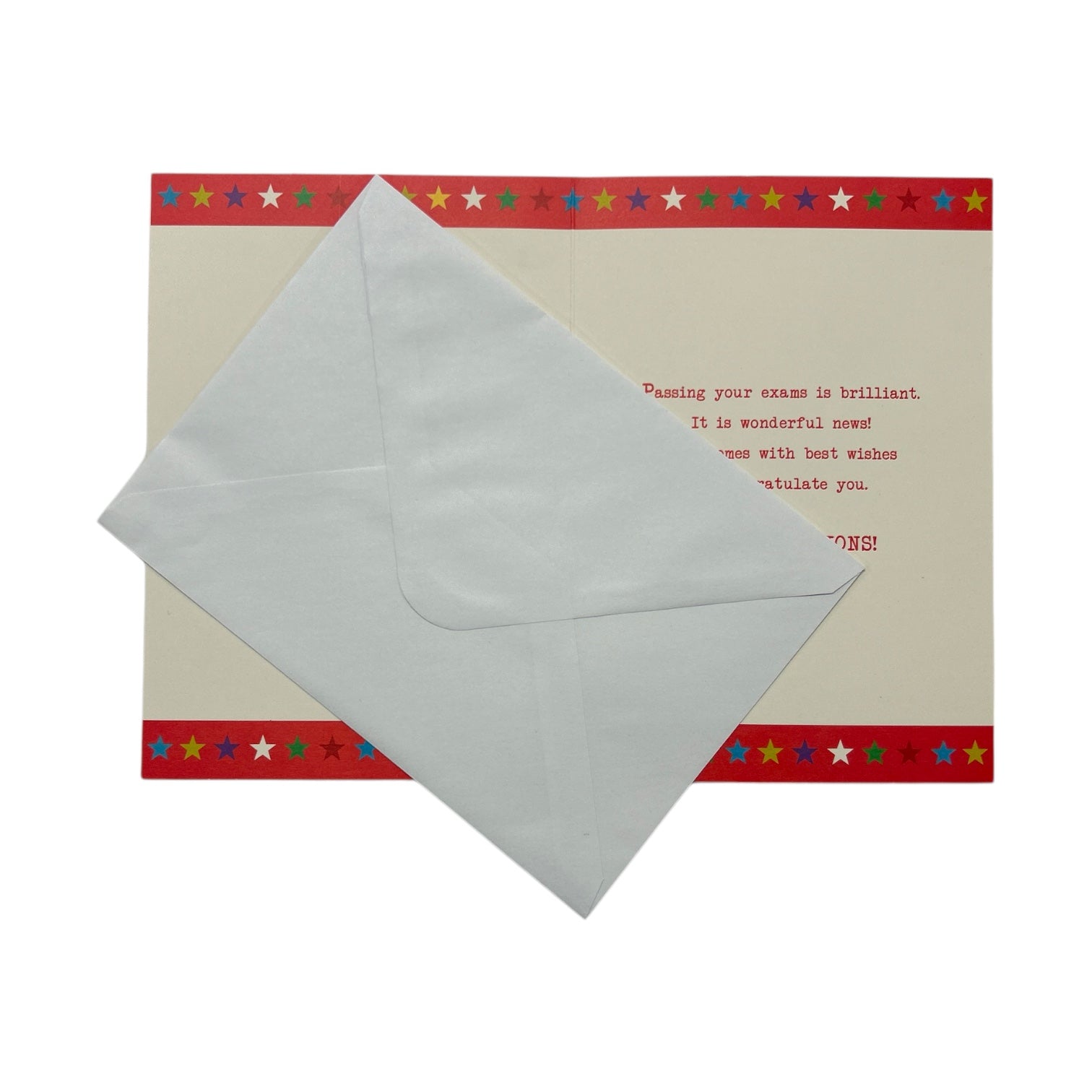 This is a vibrant and celebratory card with a red background. The design includes colorful stars scattered across the card, along with a large blue and yellow striped pencil illustration. A decorative multicolored star border frames the edges, adding to the festive and cheerful feel. This card is perfect for congratulating on their achievement with warm wishes. The elegant design is enhanced with embossed details foil accents. Complete with a coordinating envelope. Card size: Approx. 19.5 x 14 cm.