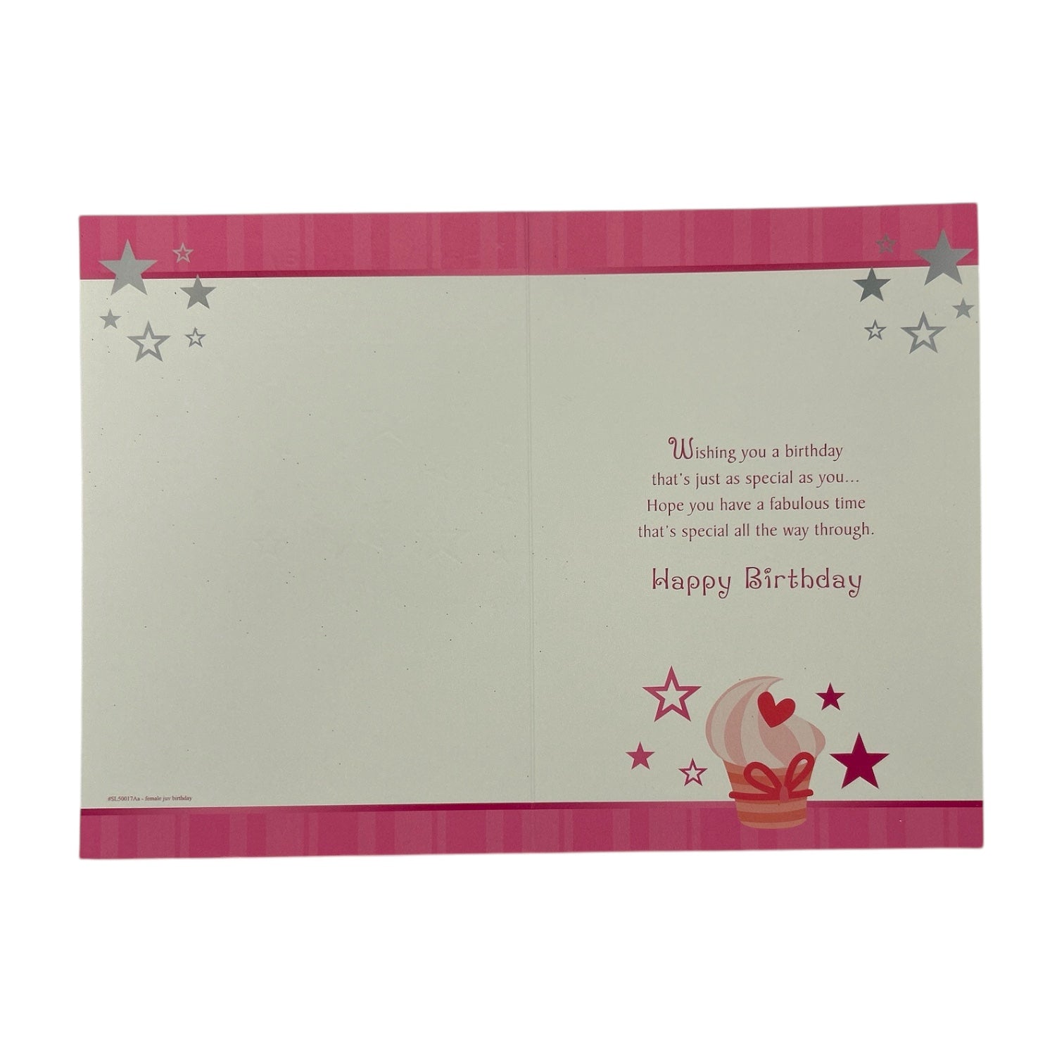 This Granddaughter Birthday Card showcases a delightful pink and gold design, featuring a charming combination of cupcakes, stars, and elegant typography. The composition is dominated by a vibrant pink background, enhanced by a vertical stripe of smaller cupcakes and stars. Each cupcake is uniquely designed, with various frosting styles and decorative toppings, adding to the card’s playful charm. The glitter accents bring a touch of shimmer, making the card feel extra special. At the center, the words "Happy Birthday Granddaughter" stand out in elegant silver-colored lettering, creating a beautiful focal point. Inside, the card continues the festive theme with heartfelt birthday wishes, making it a perfect choice for celebrating a beloved Granddaughter’s special day. The card comes with a coordinating envelope. Card size: Approx. 19.5 x 14 cm.
