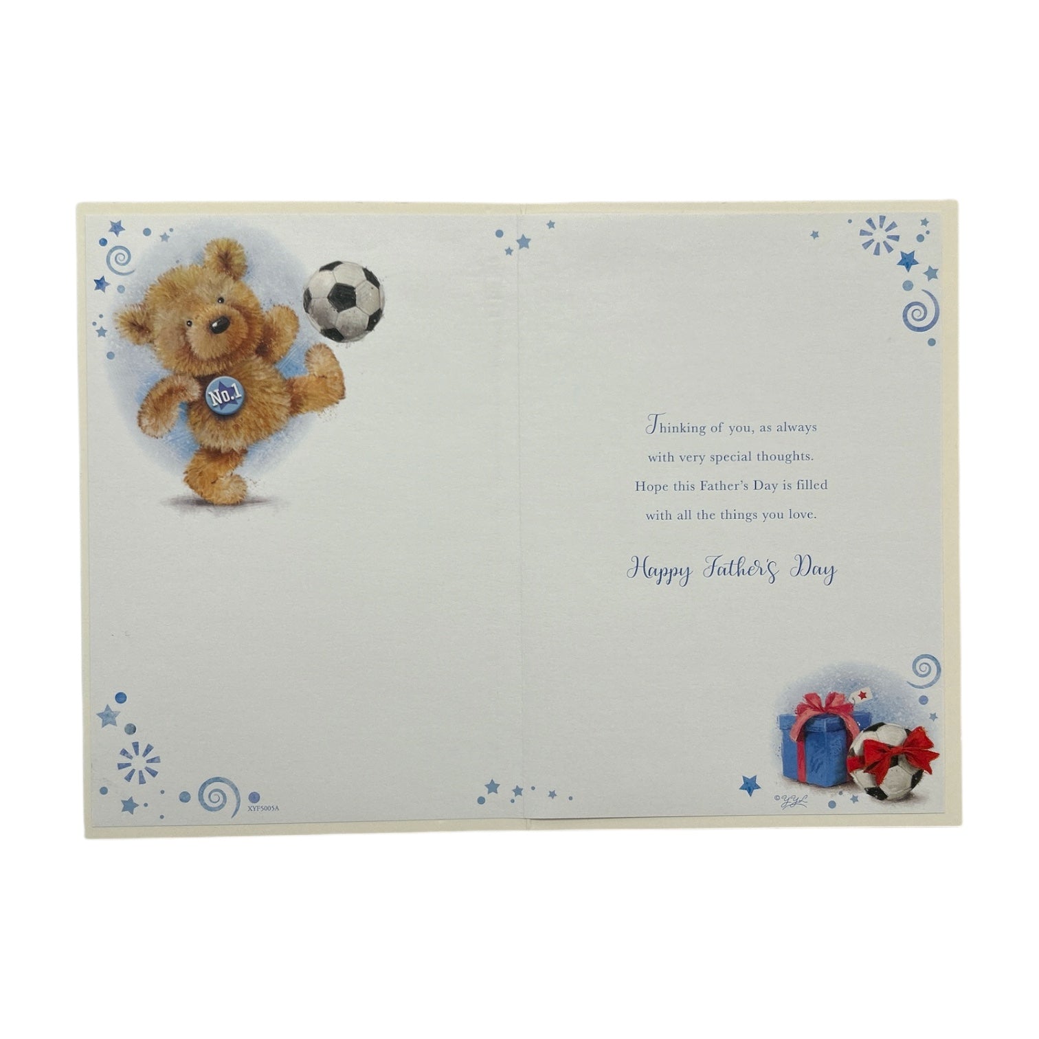 Celebrate Father’s Day with this fun and heartwarming card for your husband. The front features an adorable teddy bear playfully kicking a football, capturing the spirit of fun and family. The design is beautifully enhanced with foil details and embossed elements, adding depth and a touch of elegance. Inside, you'll find heartfelt wishes to express your love and appreciation for the amazing father and partner he is. The card comes with a coordinating envelope. Card size: approximately 27 x 18 cm.