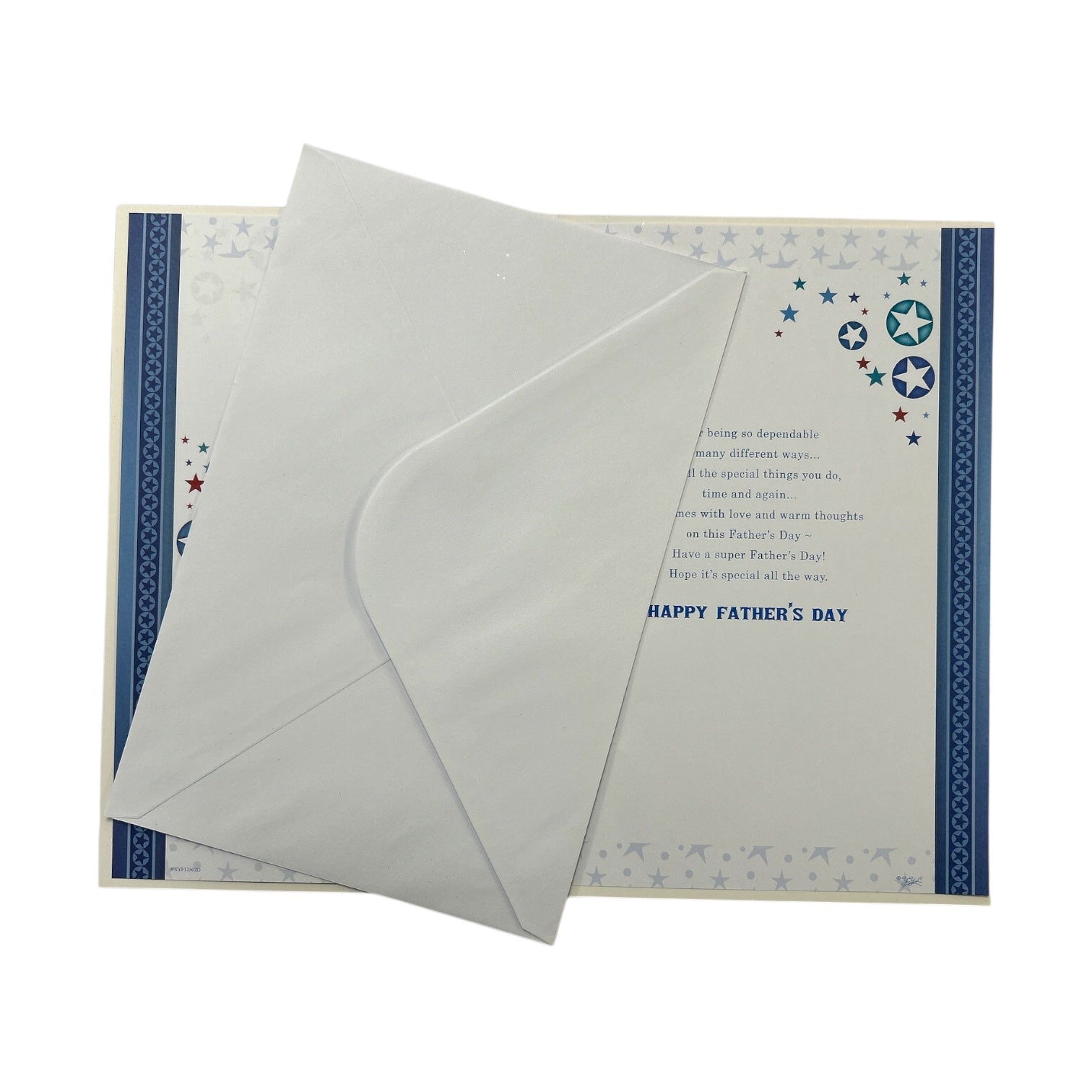 Celebrate Father's Day with this thoughtful Card. The front of the card showcases a vibrant design featuring a trophy, gifts, and rewards, celebrating his achievements and the joy he brings to your family. Adorned with foil details and an embossed element, the card has a sophisticated touch, while the glitter finish adds a delightful sparkle. Inside, you'll find heartfelt sentimental wishes that convey your appreciation and love. This card comes with a coordinating envelope. Card Size: Approx. 27 x 18 cm.