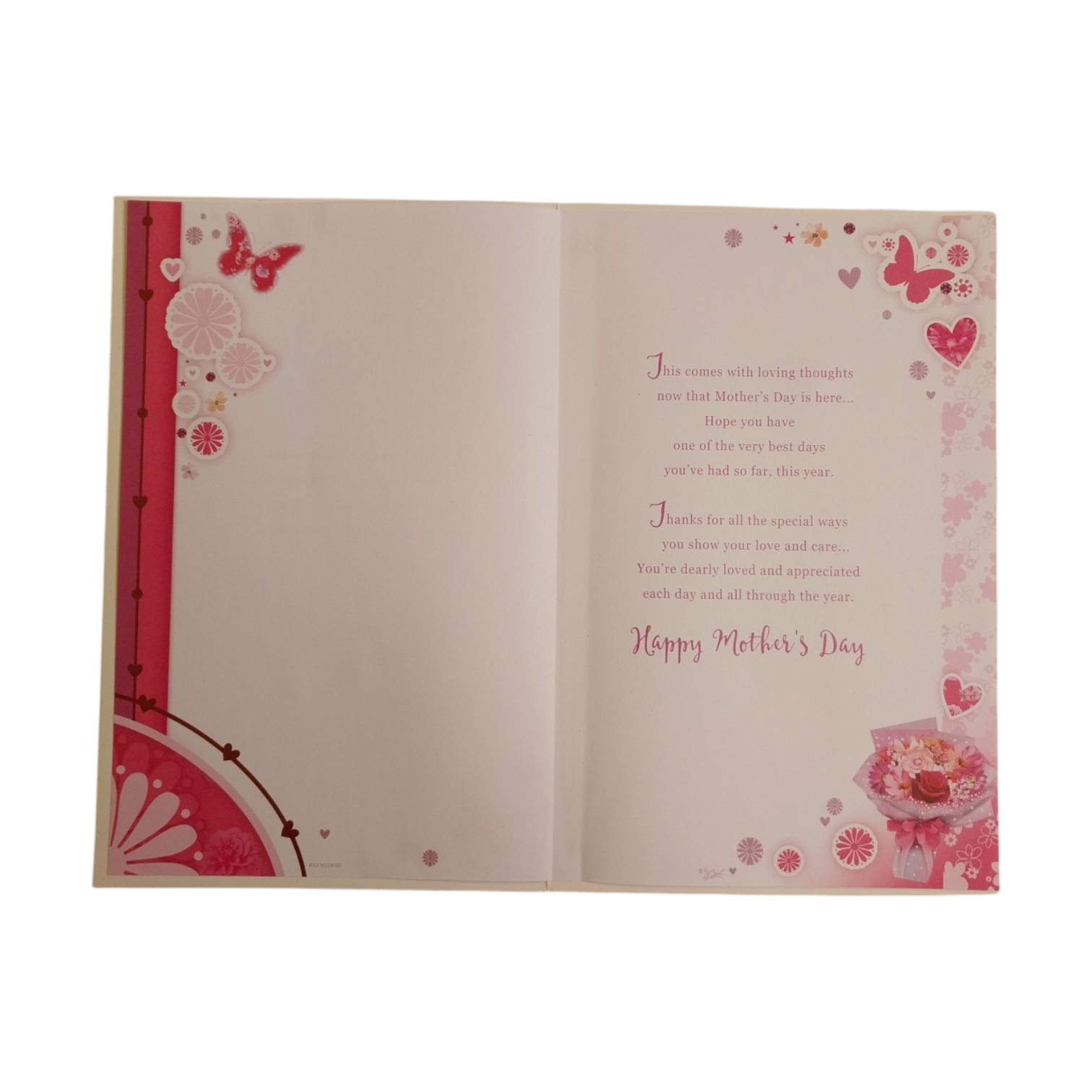 Send your Wife a beautiful Mother's day wish and let her know she means the world to you with this Mother's Day card from Xpress Yourself. A pretty card, suitable for sending a kind, heartfelt message to your Wife on mother's day. Featuring a beautiful design of attractive Flower bouquet hearts and butterflies, with the heartfelt message with embossed, gold foil and glitter finished details. The card comes with a coordinating envelope. Card size approx. : 27.5 x 18.5cm.
