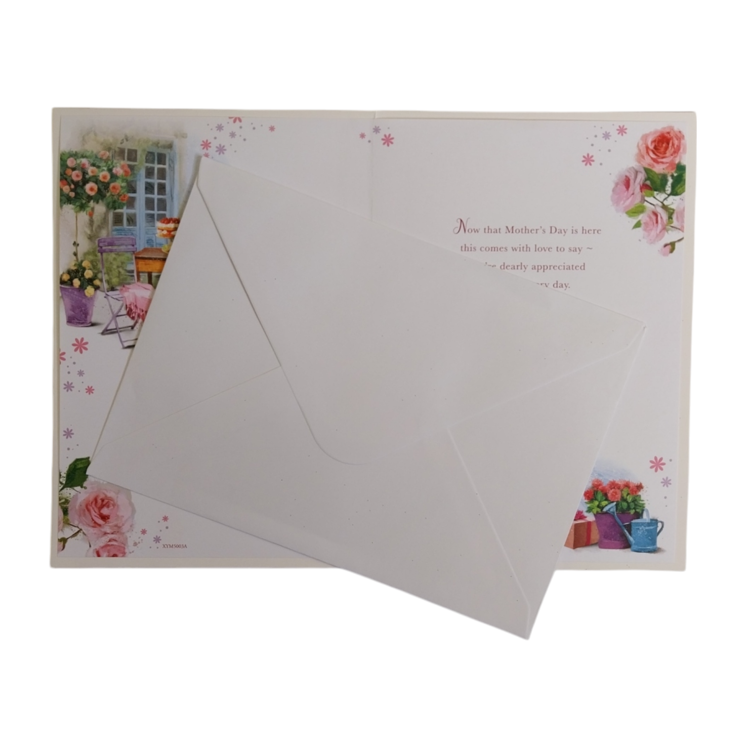 Send your wife a beautiful Mother's day wish and let her know she means the world to you with this Mother's Day card from Xpress Yourself. A pretty card, suitable for sending a kind, heartfelt message to your lovely wife on mother's day. Featuring a beautiful garden scene design with the heartfelt message with a flowers and embossed, gold foil and glitter finished details. The card comes with a coordinating envelope. Card size approx. : 235 x 127mm.
