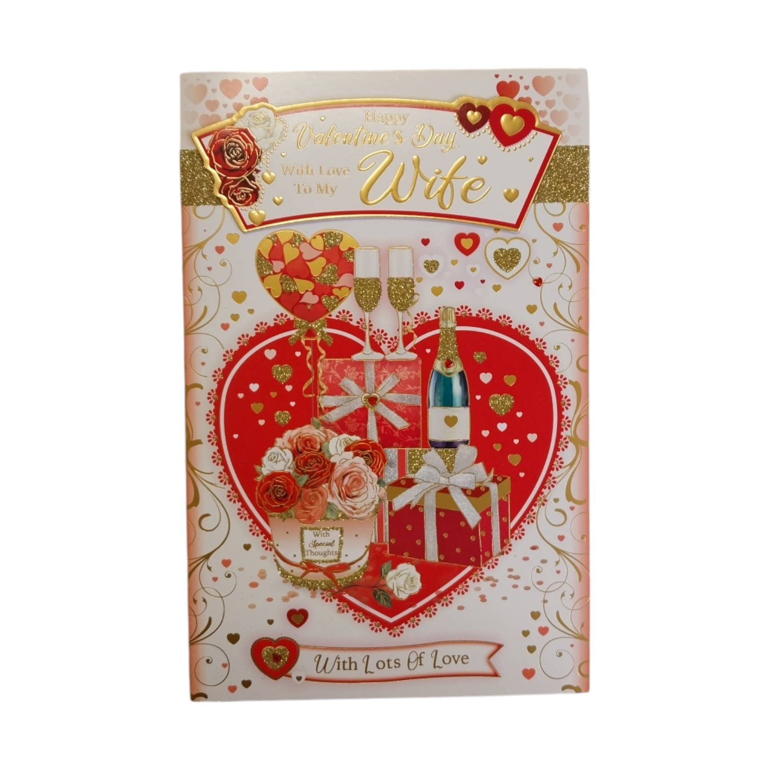 To My Wife Hearts And Gifts Design Valentine's Day Card. Say a simple happy Valentine's day to Your Wife with this stunning Valentine's day card from Xpress Yourself. The perfect way to send lots of heartfelt words and make loving, new moments. Printed on high-quality board, this card features foil details, a 3D gold glitter, message inside. The perfect keepsake for valentines day, fill the inside with words of love and admiration.