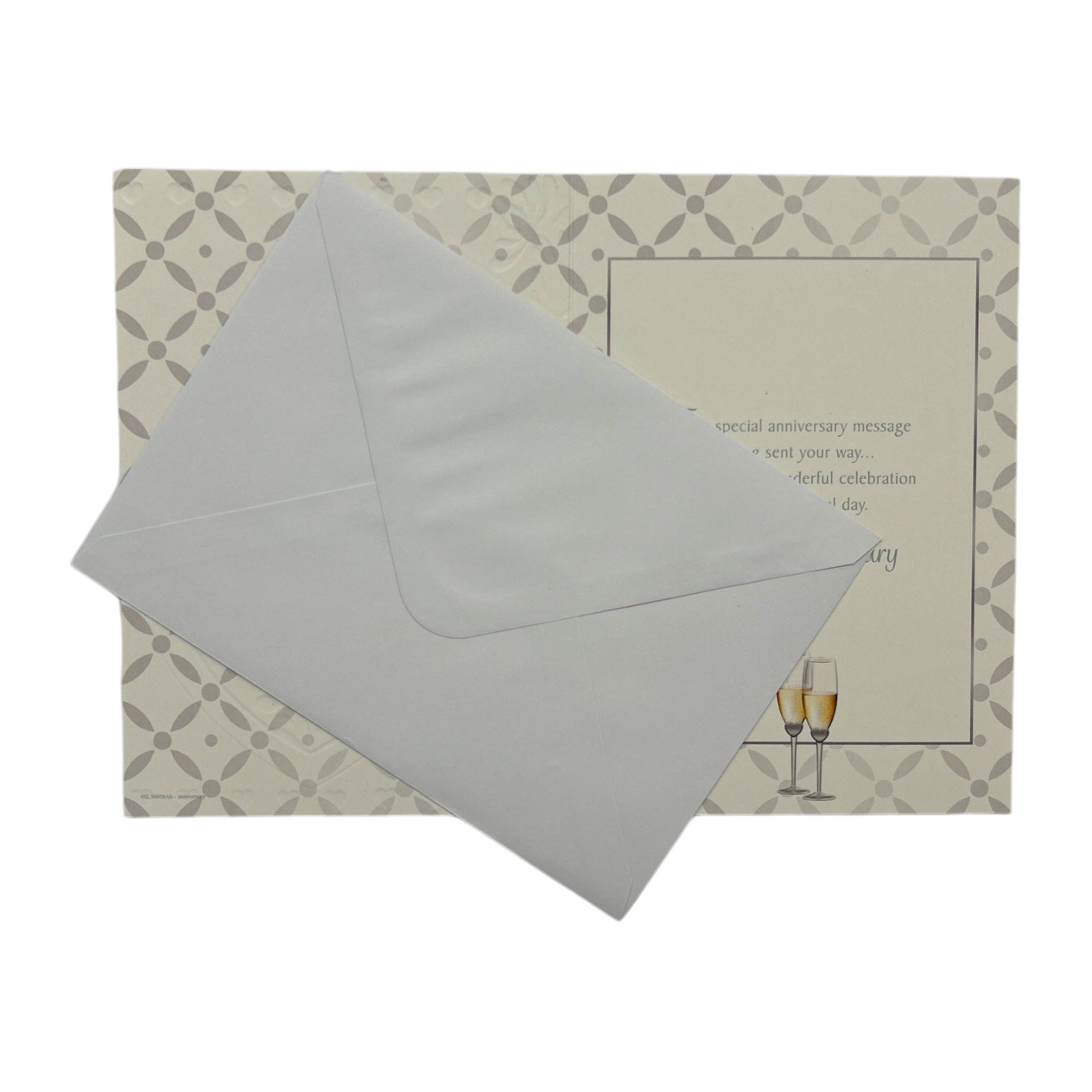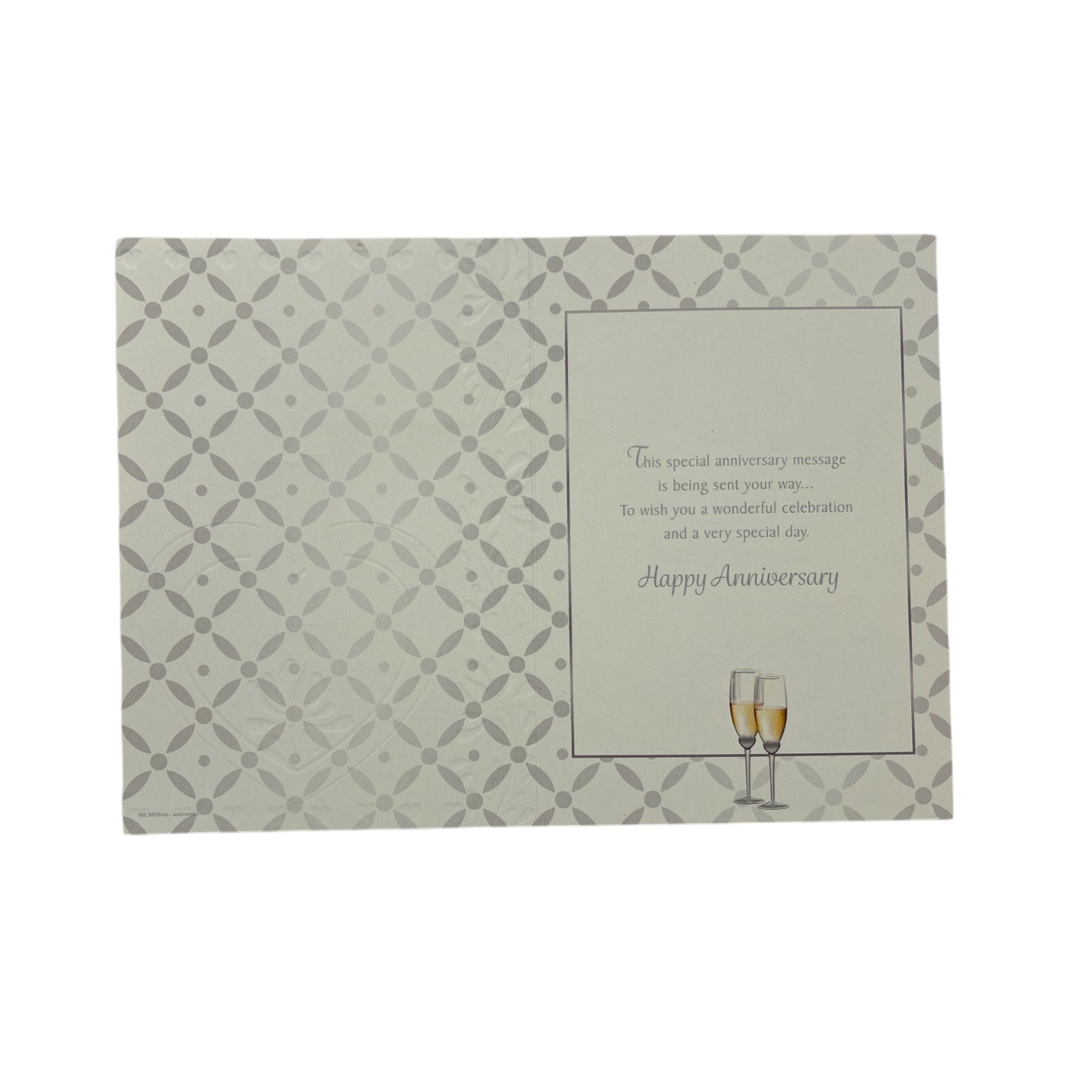 This elegant white greeting card is designed to celebrate a Sister & Brother-in-Law's Anniversary with grace and charm. At the center, a silver heart design serves as the focal point, beautifully embellished with an intricate lacework or floral pattern in a soft light gray shade. Within the heart, two champagne flutes stand gracefully, their stems intertwined and tied together with a delicate gold ribbon, symbolizing unity and love. Above the flutes, the heartfelt message, "Happy Anniversary Sister & Brother-in-Law," is elegantly printed in a decorative font, drawing attention to the occasion. Inside, thoughtful anniversary wishes complete this beautifully crafted card, making it a perfect keepsake for the special couple. The card comes with a coordinating envelope. Card size: Approx. 19.5 x 14 cm.