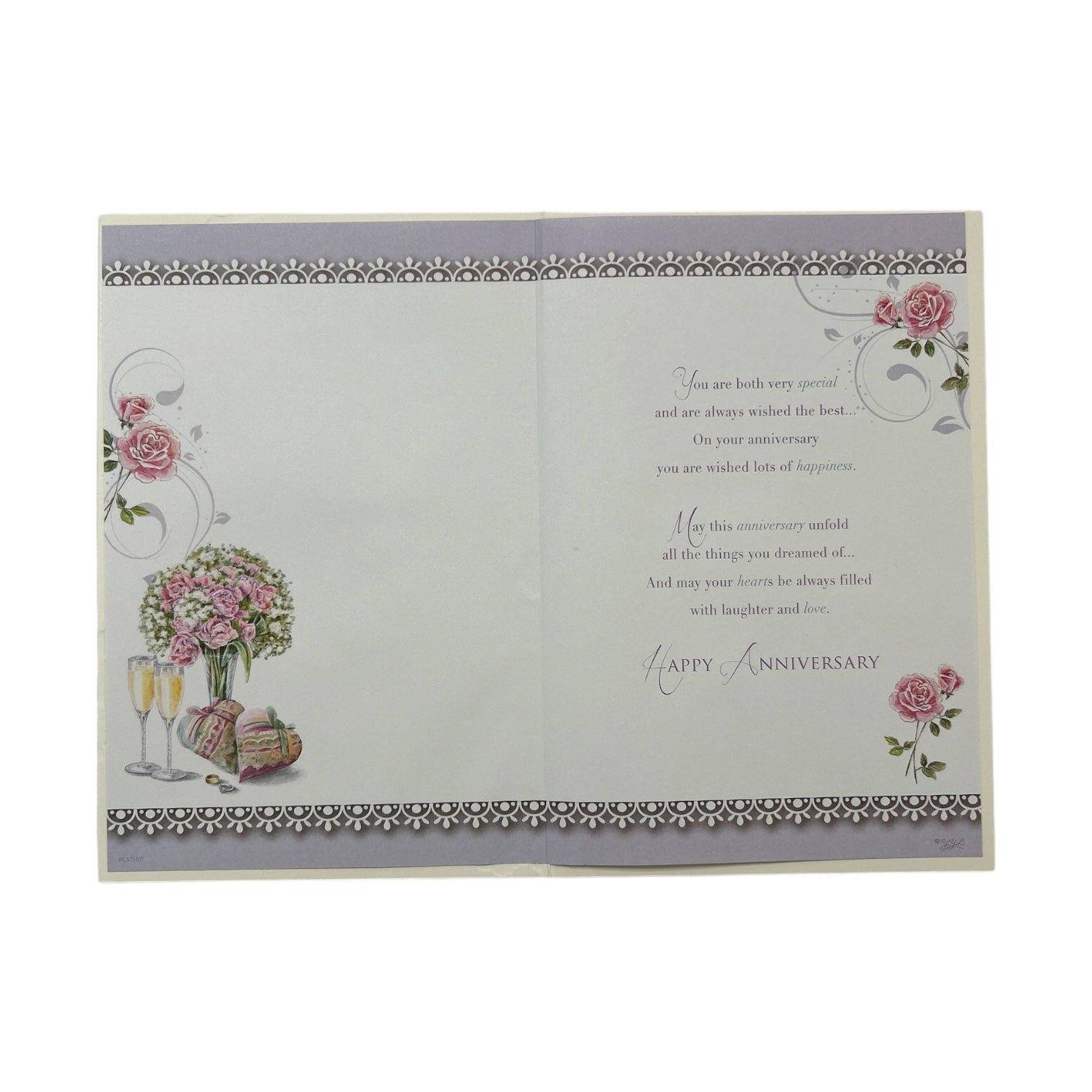 A lovely card, suitable for sending a kind, heartfelt message to your Son and Daughter-in-Law on their anniversary. featuring an artistic design of love hearts and a champagne glasses, finished with embossed foil details and a "To a Special Son & Daughter-In-Law on your Anniversary" message on the front. The card comes with a coordinating envelope. This appealing card will let the lovely couple know that they are in your thoughts and that you want to send them good wishes on their special day. Receiving a card always makes someone feel good, giving them a warm feeling to know that someone has taken the time to select a card especially for them. Card Size Approx.: 23 x 15.5cm.
