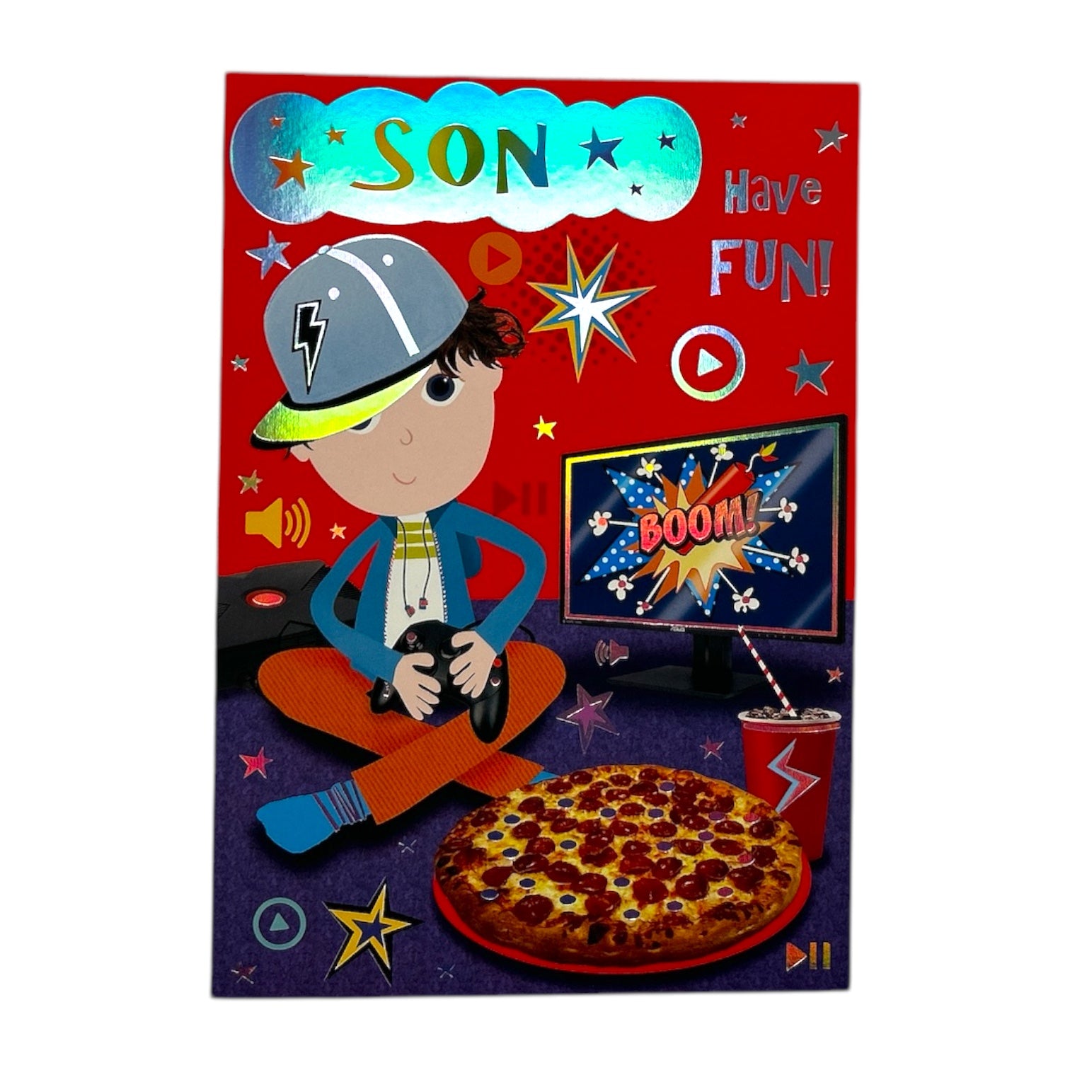 Make your son's birthday extra special with this fun and exciting card! The front design features a boy seated and fully immersed in playing video games, surrounded by a gaming console, pizza, and a drink—creating the perfect gaming setup. His expression reflects focus and excitement, capturing the joy of a great gaming session. The bold red background adds energy to the design, making it eye-catching and dynamic. At the top, the words "SON Have FUN!" are prominently displayed in a multicolored, slightly embossed font, adding to the celebratory feel. Inside, the card contains warm birthday wishes, making it the perfect choice for a video game-loving boy. The card comes with a coordinating envelope. Card size approx. : 19 x 13cm.