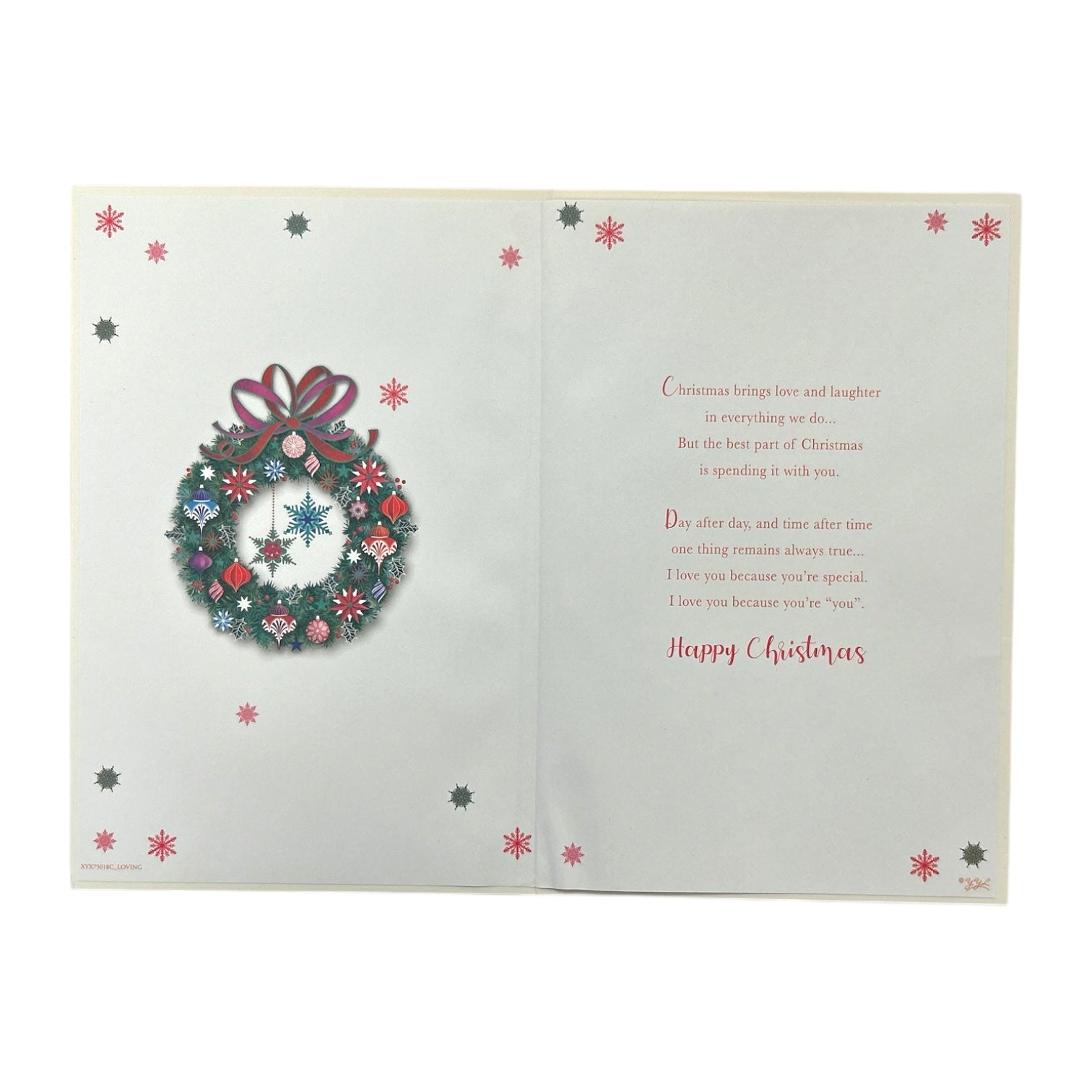 Celebrate the festive season with this elegant Christmas card, designed especially for the man in your life. Featuring a decorative wreath adorned with colorful baubles, stars, snowflakes, and a stylish red ribbon bow, the card radiates holiday cheer and festive charm. A banner at the top reads ‘HAPPY CHRISTMAS TO THE MAN IN MY LIFE,’ adding a personal and heartfelt touch. Golden snowflakes scattered around the wreath enhance the celebratory atmosphere, making this card perfect for expressing love and warm holiday wishes. Approx. size 225 x 155mm, the card comes with a coordinating envelope.