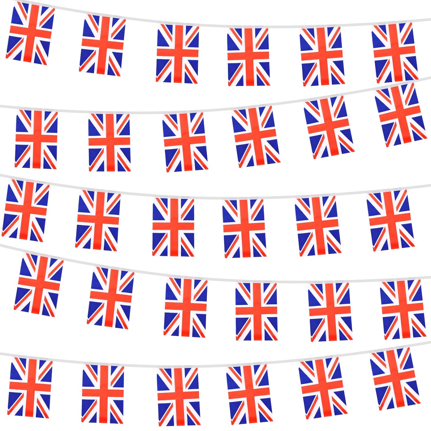 Union Jack Bunting 10m with 20 Square Flags. This bunting measures 10m and has 20 pennants. Material: PVC. Approx size of each Flag/ Pennant 30x20cm. Introducing the vibrant and versatile Bunting 10m with 20 Pennants, a delightful addition to any celebration or decorative endeavor. This charming bunting boasts a length of 10 meters, providing ample coverage to adorn various spaces with whimsical flair. Crafted with high-quality, durable materials, each of the 20 pennants is designed to withstand outdoor elements, making it suitable for both indoor and outdoor use. Whether you're hosting a festive gathering, sprucing up a garden party, or adding a pop of color to a room, this bunting is sure to captivate attention and evoke a sense of joy and celebration. With its eye-catching design and array of vibrant colors, it effortlessly infuses any setting with a playful and festive atmosphere. Ideal for birthdays, weddings, graduations, or simply adding a touch of charm to everyday life, the Bunting 10m with 20 Pennants offers endless possibilities for creative expression. Hang it along fences, walls, ceilings, or across outdoor spaces to instantly transform any environment into a visually stunning spectacle.