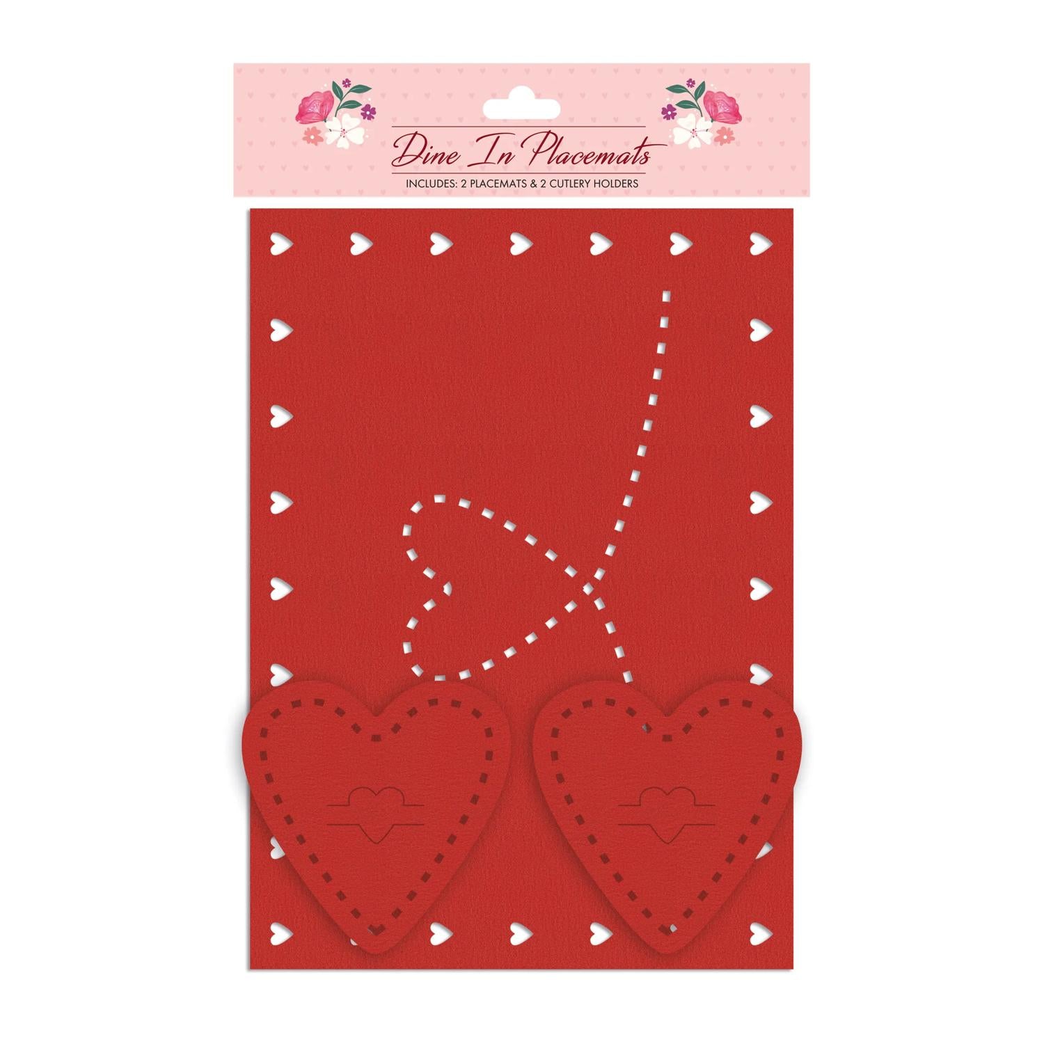 Valentine's Heart Dine In Placemat Set. Includes: 2 Placemats and 2 Cutlery Holders. Add a touch of romance to your table setting with our Love Heart Cutout Valentine's Red Felt Placemat & Coaster Set! This charming pack includes 2 intricately designed red felt placemats and matching coasters, featuring elegant heart-shaped cutouts. Perfect for celebrating Valentine's Day or any special occasion, these high-quality placemats and coasters add a lovely and festive touch to your dining experience.
