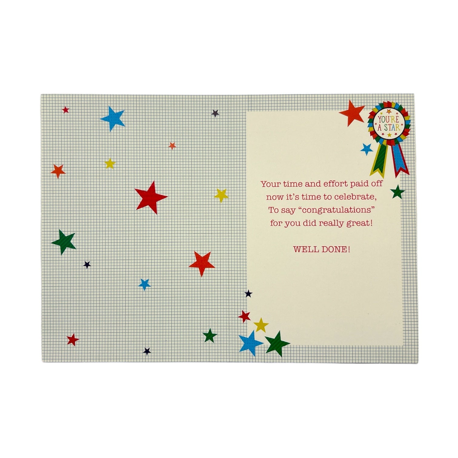 The front of the card features a large, colorful rosette with multicolored ribbons. The background is decorated with bright, colorful stars, creating a festive and celebratory feel. The design is cheerful and vibrant, making it a perfect card to congratulate someone on their academic achievement. Complete with a coordinating envelope. Card size: Approx. 19.5 x 14 cm.