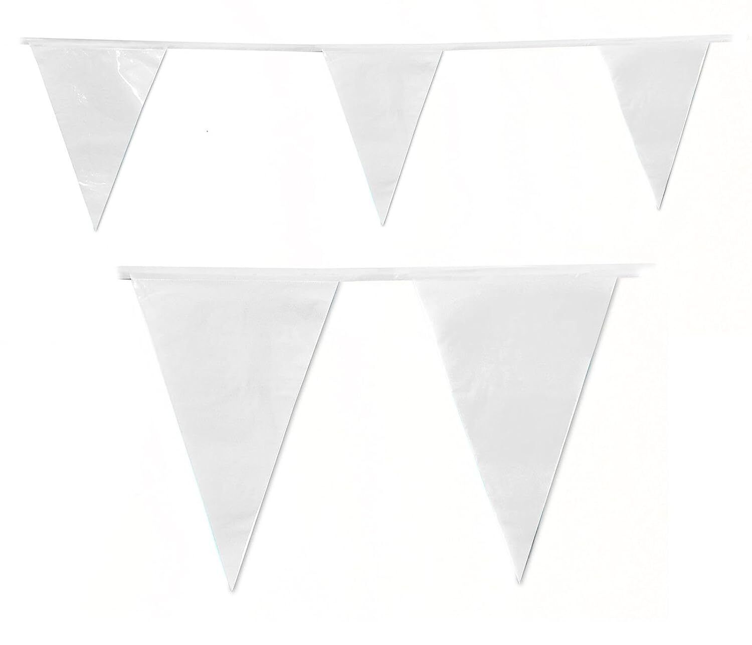 White Bunting 10m with 20 Pennants. This bunting measures 10m and has 20 pennants. Material: PVC. Approx size of each Flag/ Pennant 30x20cm.