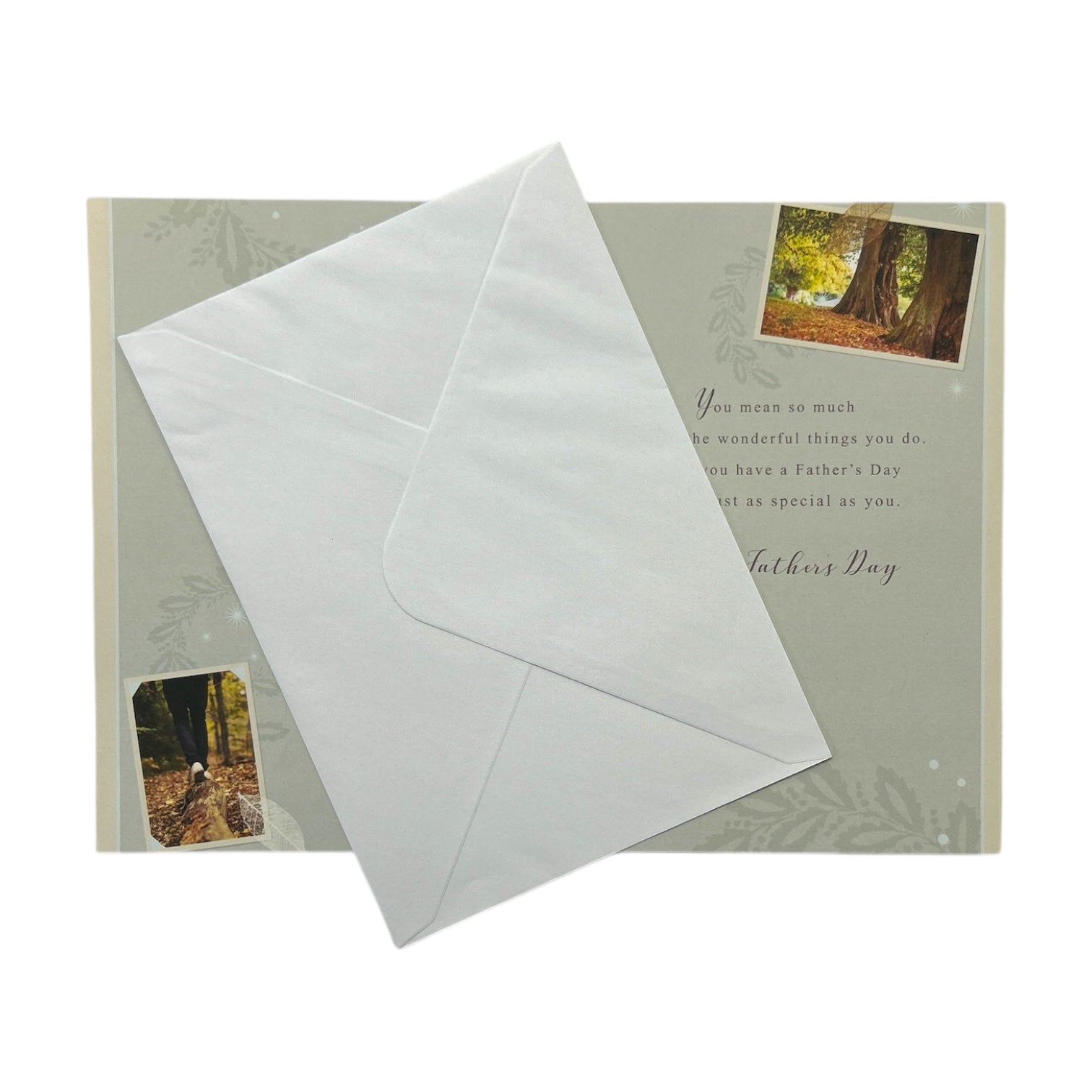 The card is decorated with three nature-themed photos: one of a person walking in a forest, another of a scenic woodland path, and a third showing the base of large, majestic trees. These images create a peaceful and nostalgic feel, emphasizing themes of nature, appreciation, and warmth. The photographic collage overlayed on the card background creates a rich, sentimental feel. Perfect for Father's Day, this card celebrates a love for forest and treasured memories. The card comes with a coordinating envelope. Approximate size: 19.5x14cm.