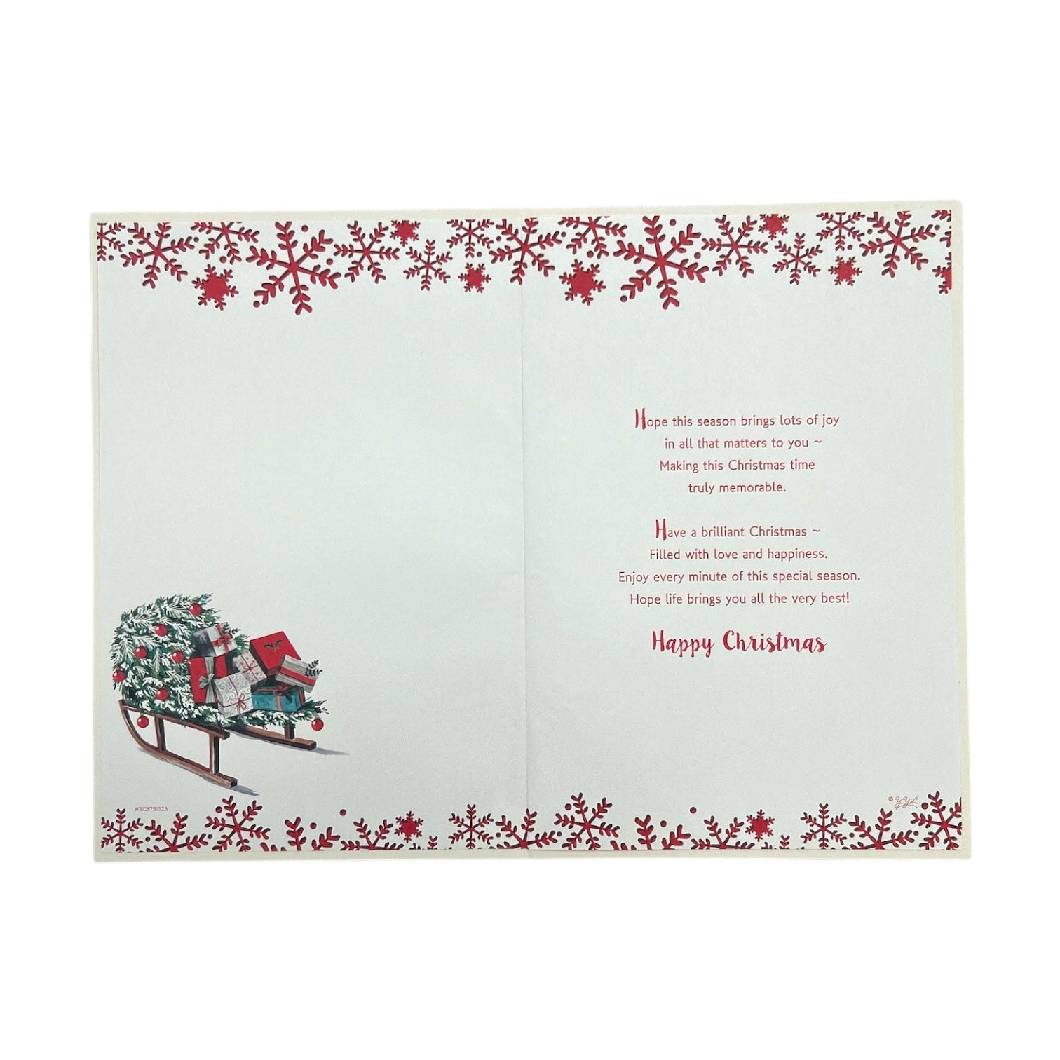 This enchanting Christmas card, featuring a charming design of gifts on a sleigh, is the perfect choice for expressing warm wishes to your partner during the holiday season. The front of the card showcases a festive scene with a sleigh piled high with beautifully wrapped gifts, inviting your partner to share in the joy and excitement of the season. Inside, there's ample space for you to pen a kind and heartfelt message, expressing your love, appreciation, and best wishes. Whether you're celebrating together or sending your sentiments from afar, this card is a thoughtful way to let your partner know how much they mean to you during this special time of year. With its charming design and heartfelt message, this card is sure to make your partner feel cherished and loved. It's the perfect choice for sending a kind and thoughtful greeting that captures the spirit of Christmas and the depth of your love for your dear partner.