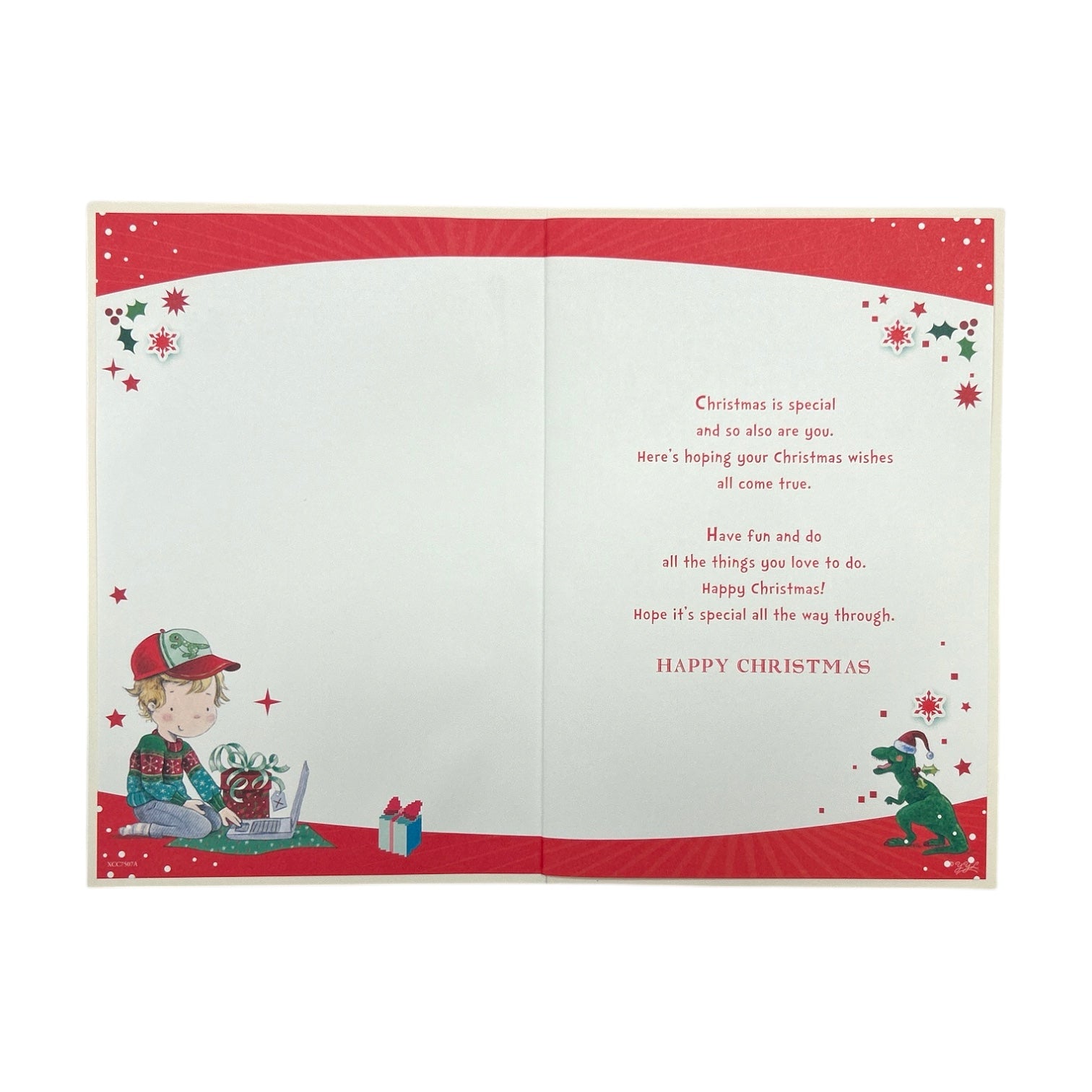 Bring a playful twist to the holiday season with this imaginative Christmas card full of color and cheer. Featuring a child in cozy festive attire seated at a laptop, this design blends modern holiday vibes with whimsical charm. A cheerful green dinosaur in a Santa hat — affectionately dubbed “Christmas Tree Rex!” — adds a fun surprise that’s sure to delight. Surrounded by stars, snowflakes, holly, and wrapped gifts, the scene captures the joyful chaos of Christmas magic. The bold badge and thoughtful message make it ideal for children or anyone who loves lighthearted greetings. Inside, warm wishes await to brighten the recipient’s festive season. It’s a joyful blend of tradition and creativity, perfect for spreading smiles.